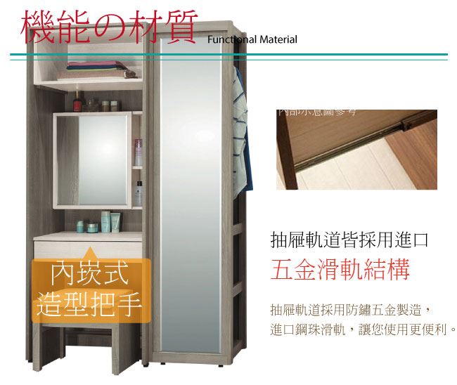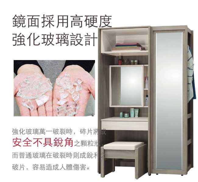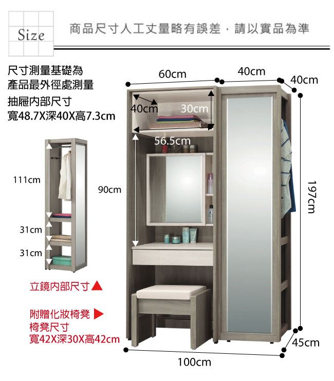 材質 | ◆產品名稱: 【綠家居】歐倫勒 時尚3.3尺雙鏡面鏡台衣櫃/收納櫃組合(含化妝椅+鏡台衣櫃+穿衣鏡面櫃) 尺寸:(寬)100x(深)45x(高)197公分 ◆材質: 材質:防蛀木心板+防潮耐磨腳座+強化玻璃鏡面+五金滑軌結構 外層採用全包式防潮耐磨噴漆處理