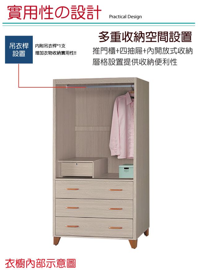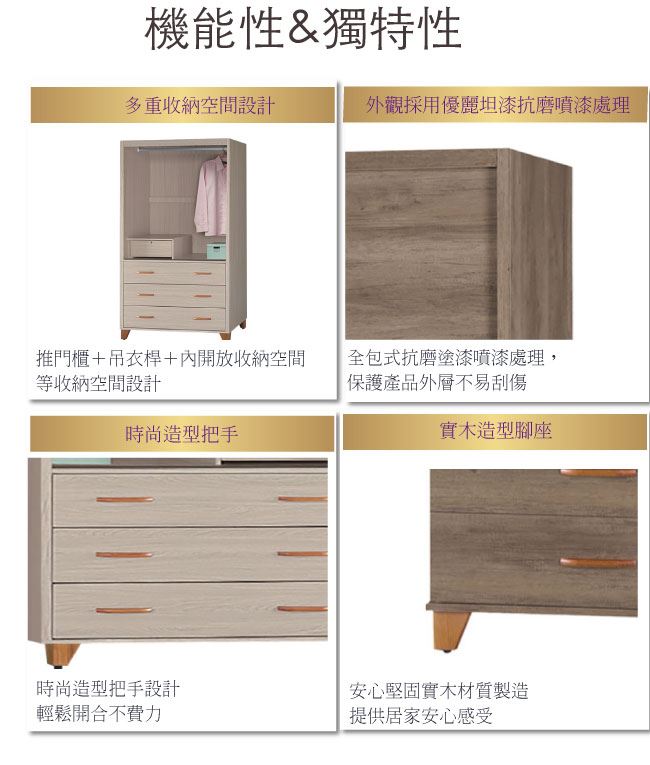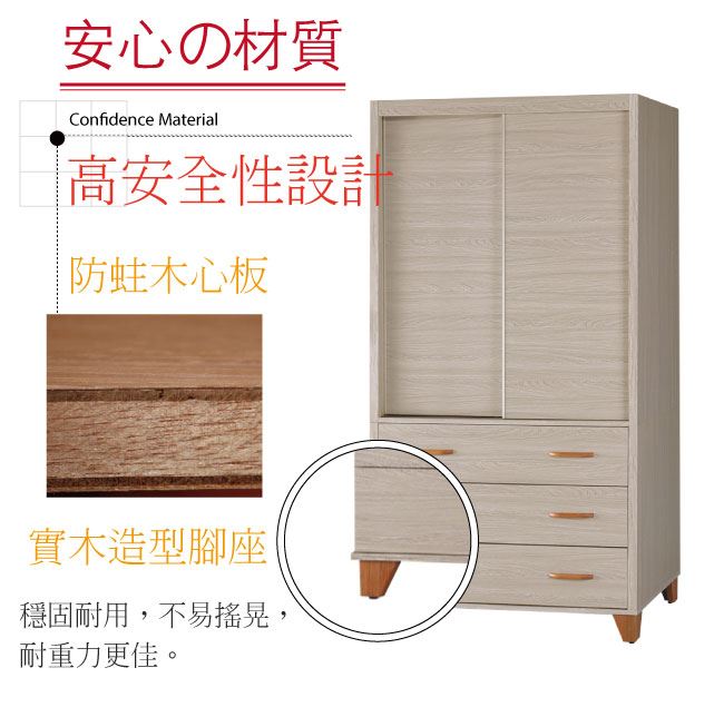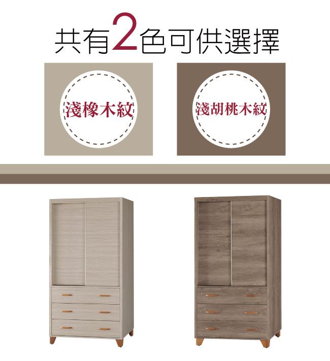 商品介紹 | 【綠家居】法尼莫 時尚3.5推門三抽衣櫃/收納櫃(二色可選) 木紋雙色系+現代簡約風格+安心材質製造,整體採用防蛀木心板+防潮實木腳座+五金滑軌結構等安心材質製造,外層採用全包式防潮耐磨噴漆處理搭配採用推門櫃+吊衣桿+三抽屜(衣櫃內另含小抽屜一個)+內開放式收納層格等收納空間設計,全由專人配送到家,專業安心服務,替你省下更多時間! 【商品特色】 木紋雙色系+現代簡約風格+安心材質製造,使用放心+搭配居家更便利 採用防蛀木心板+防潮實木腳座+五金滑軌結構等安心材質製造 採用推門櫃+吊衣桿+三抽屜(衣櫃內另含小抽屜一個)+內開放式收納層格等收納空間設計 此商品不需要DIY組立,此商品為組立後之成品 品質保證、專業設計、貼心服務 全由專人配送到家,專業安心服務,替您省下更多時間 |