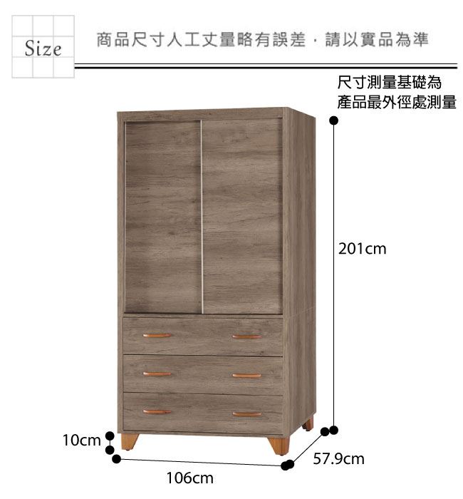 材質 | ◆產品名稱: 【綠家居】法尼莫 時尚3.5推門三抽衣櫃/收納櫃(二色可選) 尺寸:(寬)106x(深)57.9x(高)201公分 ◆材質: 材質:防蛀木心板+防潮實木腳座+五金滑軌結構 外層採用全包式防潮耐磨噴漆處理