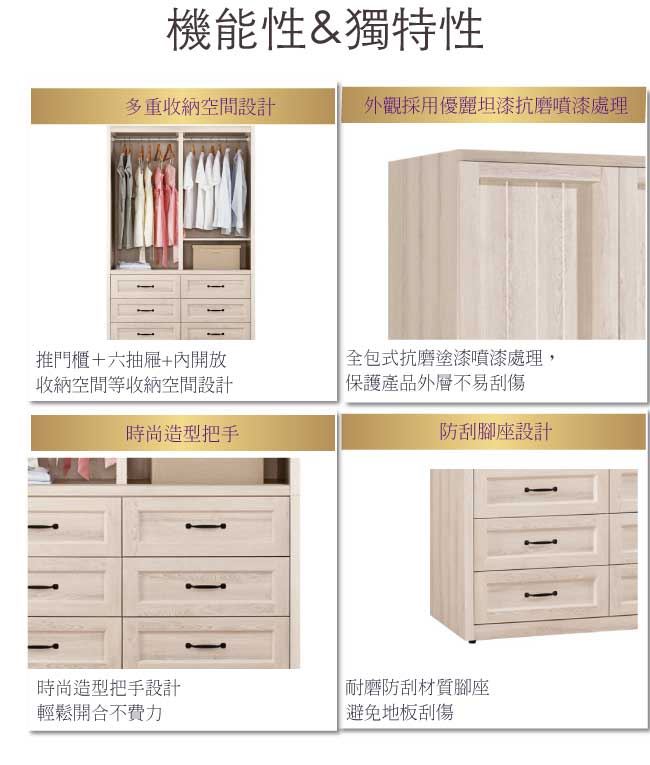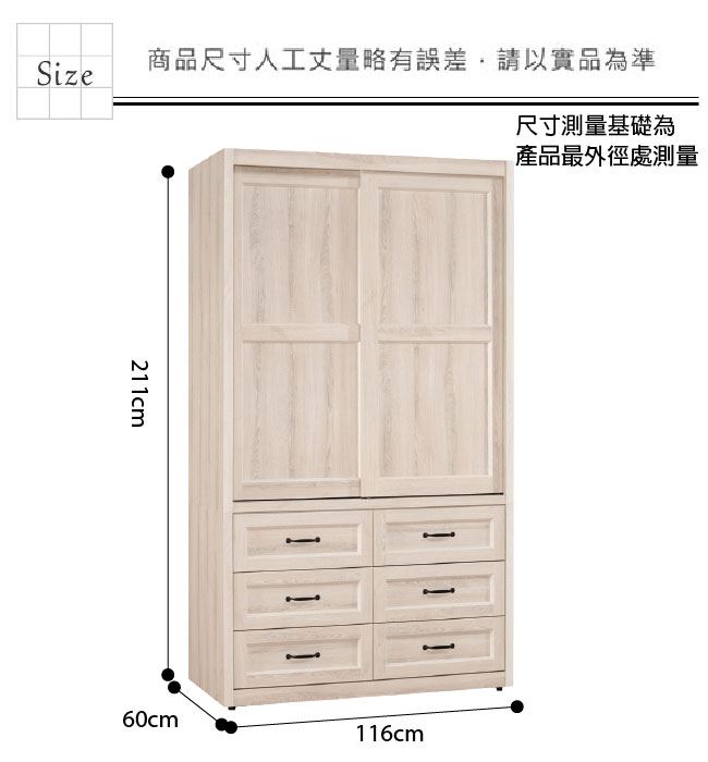 材質 | ◆產品名稱: 【綠家居】馬拉提 淺橡3.9尺推門六抽衣櫃 產品尺寸: 尺寸:(寬)116x(深)60x(高)211/公分 ◆材質: 材質:防蛀木心板+防潮耐磨腳座 材質:五金滑軌結構 塗漆:優利坦全包式耐磨噴漆處理