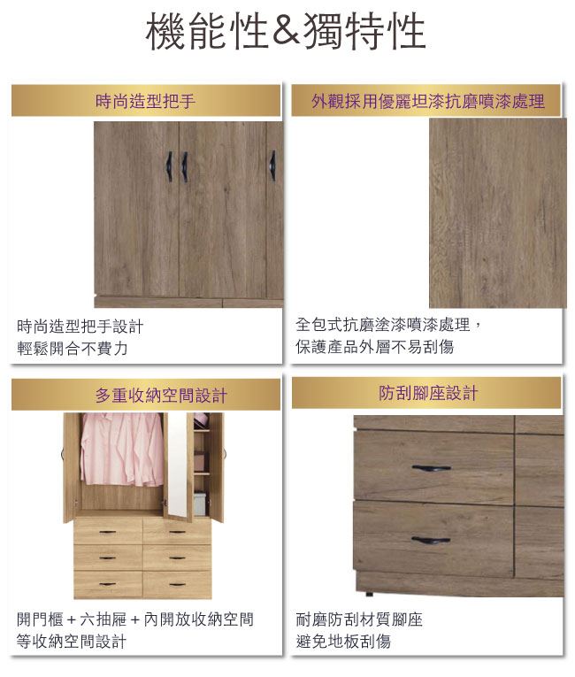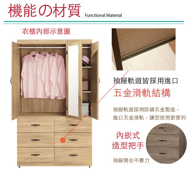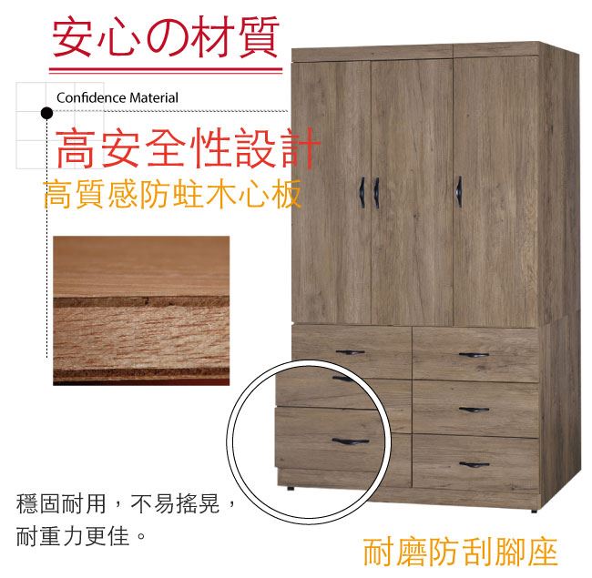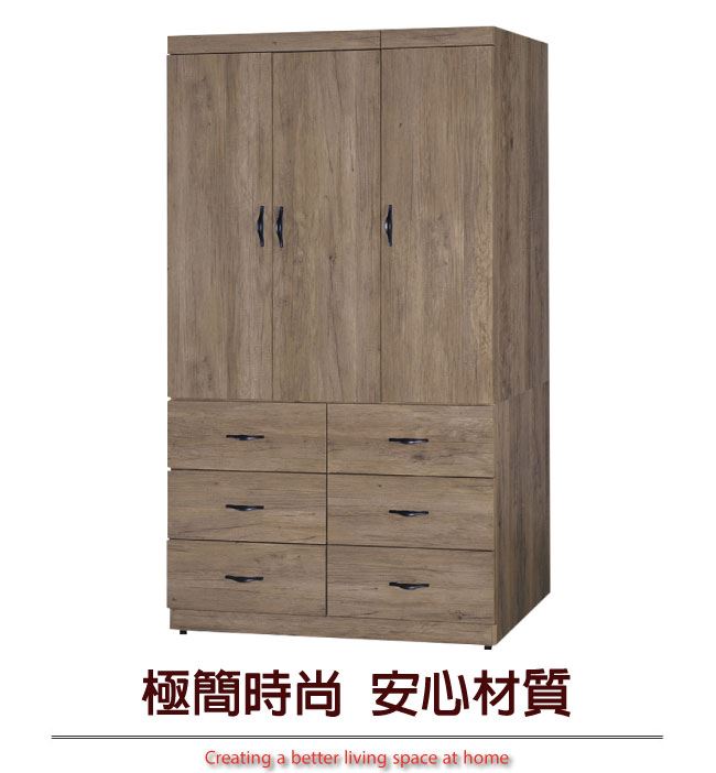 商品 介紹 | 【綠家居】瑞典 時尚3.8尺三門六抽衣櫃/收納櫃 橡木紋色+現代簡約風格+安心材質製造,整體採用防蛀木心板+五金滑軌結構+防潮耐磨腳座等安心材質製造,搭配採用開門櫃+吊衣桿+六抽屜+內開放式收納層格等收納空間設計,全由專人配送到家,專業安心服務,替你省下更多時間! 【商品特色】 橡木紋色+現代簡約風格+安心材質製造,使用放心+搭配居家更便利 採用防蛀木心板+五金滑軌結構+防潮耐磨腳座等安心材質製造 採用開門櫃+吊衣桿+六抽屜+內開放式收納層格等收納空間設計 此商品不需要DIY組立,此商品為組立後之成品 品質保證、專業設計、貼心服務 全由專人配送到家,專業安心服務,替您省下更多時間 |
