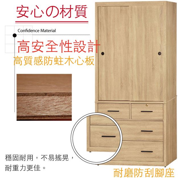 材質 | ◆產品名稱: 【綠家居】阿斯馬 時尚3.2尺推門四抽衣櫃/收納櫃(二色可選) 尺寸:(寬)94.5x(深)58x(高)200/公分 ◆材質: 材質:防蛀木心板+五金滑軌結構+防潮耐磨腳座
