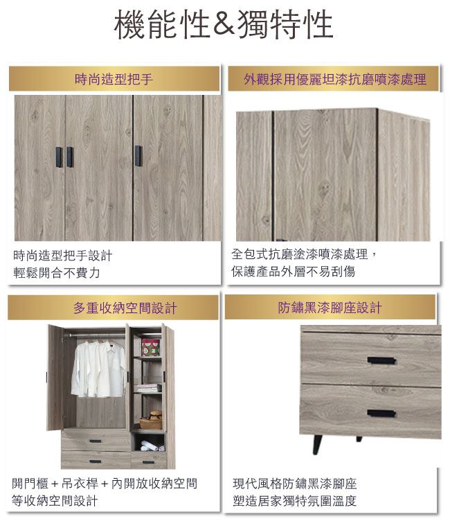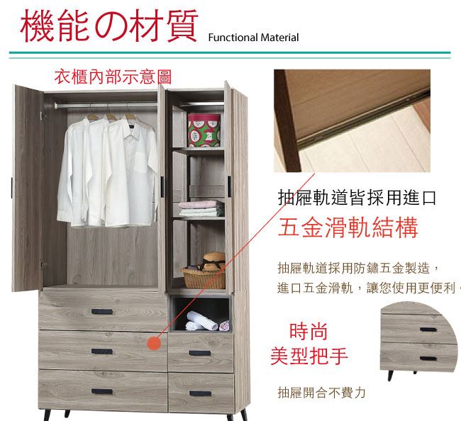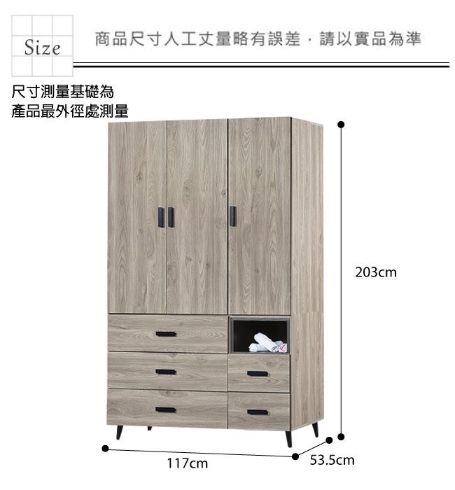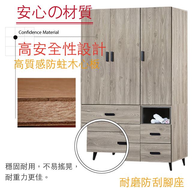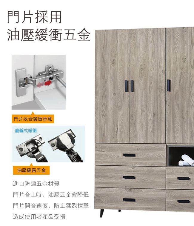 商 品 介 紹 | 【綠家居】佩芮 時尚3.9尺三門五抽衣櫃/收納櫃 橡木紋色+現代簡約風格+安心材質製造,整體採用防蛀木心板+防夾手緩衝門片五金結構+防鏽黑漆腳座+五金滑軌結構等安心材質製造,外層採用全包式防潮耐磨噴漆處理搭配採用開門櫃+五抽屜+吊衣桿+內&外開放式收納層格等收納空間設計,全由專人配送到家,專業安心服務,替你省下更多時間! 【商品特色】 橡木紋色+現代簡約風格+安心材質製造,使用放心+搭配居家更便利 採用防蛀木心板+防夾手緩衝門片五金結構+防鏽黑漆腳座+五金滑軌結構等安心材質製造 採用開門櫃+吊衣桿+五抽屜+內&外開放式收納層格等收納空間設計 此商品不需要DIY組立,此商品為組立後之成品 品質保證、專業設計、貼心服務 全由專人配送到家,專業安心服務,替您省下更多時間 |