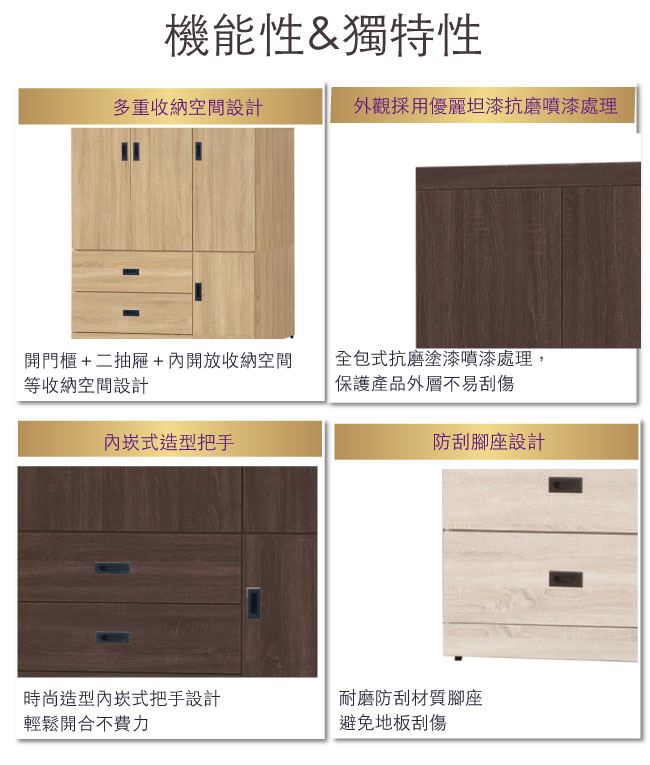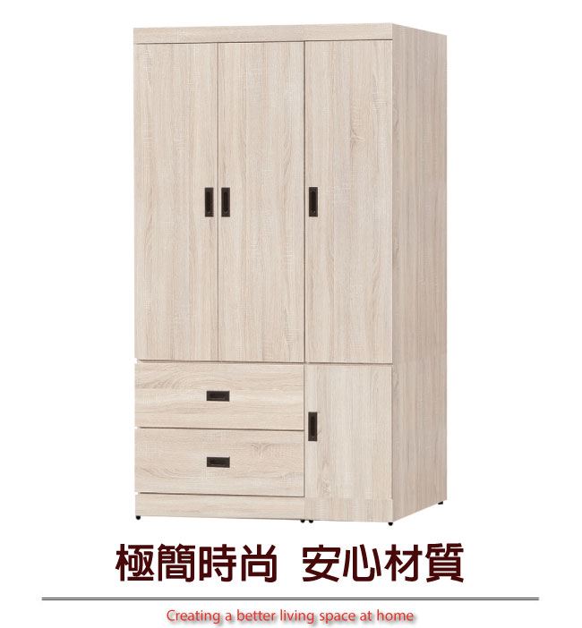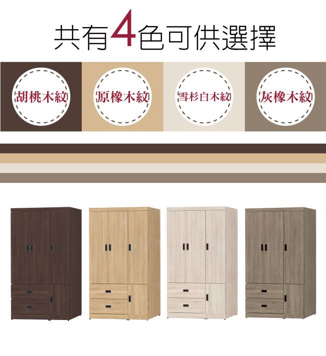 商 品 介 紹 | 【綠家居】夏依 時尚3.9尺四門二抽衣櫃/收納櫃(四色可選) 四色可選+現代簡約風格+安心材質製造,整體採用防蛀木心板+防潮耐磨腳座+五金滑軌結構+防夾手緩衝門片五金等安心材質製造,外層採用全包式防潮耐磨噴漆處理搭配採用開門櫃+吊衣桿+二抽屜+內開放式收納層格等收納空間設計,全由專人配送到家,專業安心服務,替你省下更多時間! 【商品特色】 四色可選+現代簡約風格+安心材質製造,使用放心+搭配居家更便利 採用防蛀木心板+防潮耐磨腳座+五金滑軌結構+防夾手緩衝門片五金等安心材質製造 採用開門櫃+吊衣桿+二抽屜+內開放式收納層格等收納空間設計 此商品不需要DIY組立,此商品為組立後之成品 品質保證、專業設計、貼心服務 全由專人配送到家,專業安心服務,替您省下更多時間 |