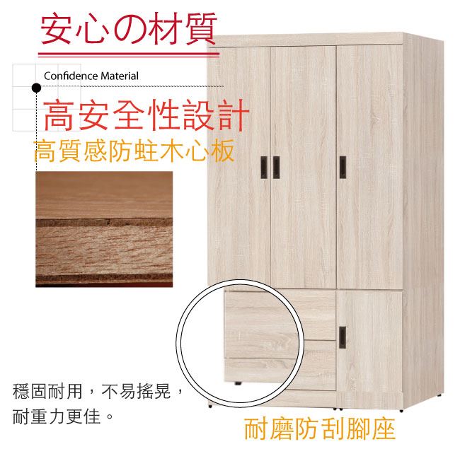 材質 | ◆產品名稱: 【綠家居】夏依 時尚3.9尺四門二抽衣櫃/收納櫃(四色可選) 尺寸:(寬)118x(深)58x(高)180公分 ◆材質: 材質:防蛀木心板+防潮耐磨腳座+五金滑軌結構+防夾手緩衝門片五金 外層採用全包式防潮耐磨噴漆處理