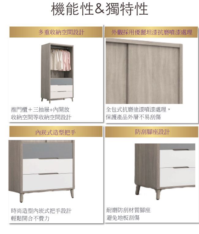 商 品 介 紹 | 【綠家居】薇斯 雙色3尺推門三抽衣櫃 木紋雙色系+現代簡約風格+安心材質製造,整體採用防蛀木心板+防潮實木腳座+五金滑軌結構等安心材質製造,外層採用優利坦全包式耐磨&亮面噴漆處理搭配推門櫃+吊衣桿+三抽屜+內開放式收納等收納空間設計,全由專人配送到家,專業安心服務,替你省下更多時間! 【商品特色】 木紋雙色系+現代簡約風格+安心材質製造,使用放心+搭配居家更便利 採用防蛀木心板+防潮實木腳座+五金滑軌結構安心材質製造 推門櫃+吊衣桿+三抽屜+內開放式收納等收納空間設計 此商品不需要DIY組立,此商品為組立後之成品 品質保證、專業設計、貼心服務 全由專人配送到家,專業安心服務,替您省下更多時間 |