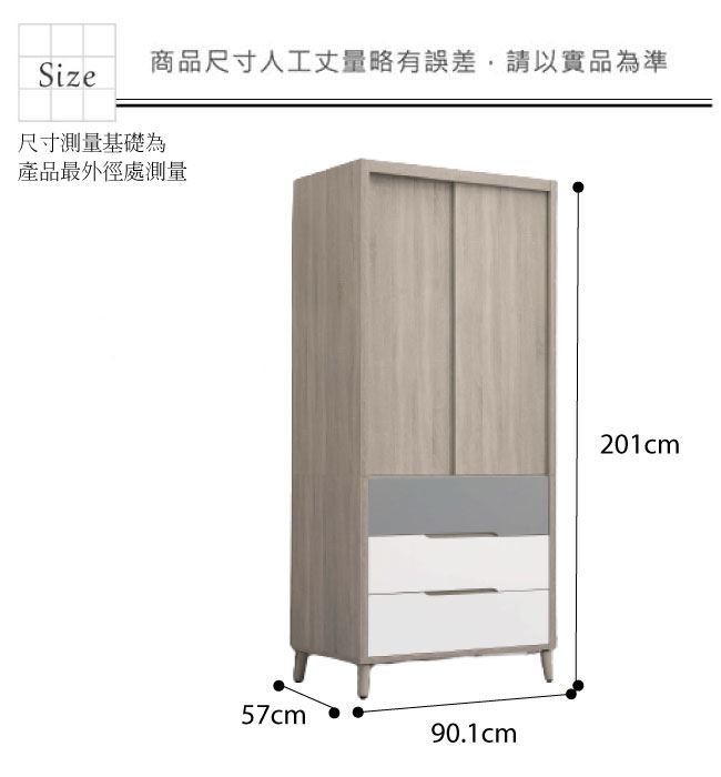 產品名稱:【綠家居】薇斯 雙色3尺推門三抽衣櫃 產品尺寸: 尺寸:(寬)90.1x(深)57x(高)201/公分 ◆材質: 材質:防蛀木心板+防潮實木腳座 材質:五金滑軌結構 塗漆:優利坦全包式耐磨&亮面噴漆處理