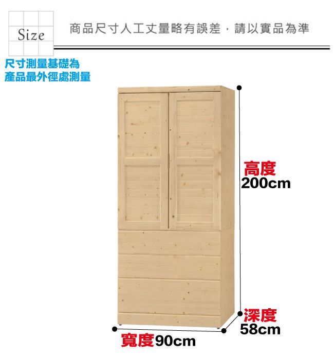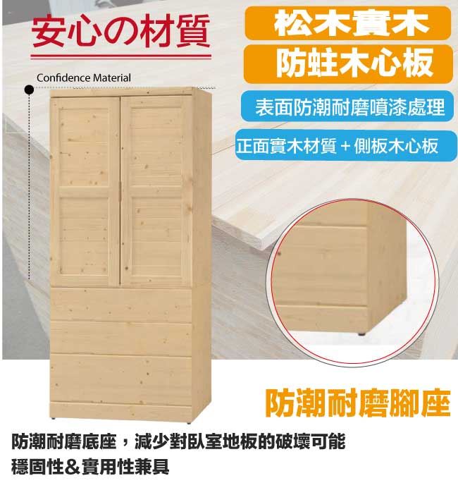 材質 | ◆產品名稱:【綠家居】沛可3尺實木二門三抽衣櫃 尺寸:(寬)90x(深)58(高)200/公分 請注意:使用松木實木產品上有些許木結紋路為自然現象,介意者請購買前多考慮!謝謝 ◆材質: 材質:松木實木+防蛀木心板+防潮耐磨腳座+五金滑軌結構 噴漆:防潮耐磨噴漆處理