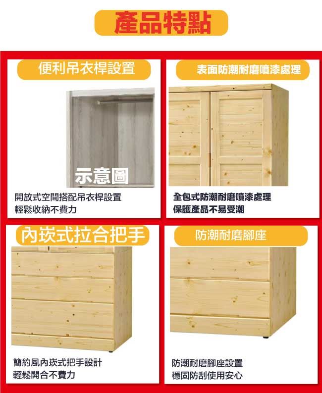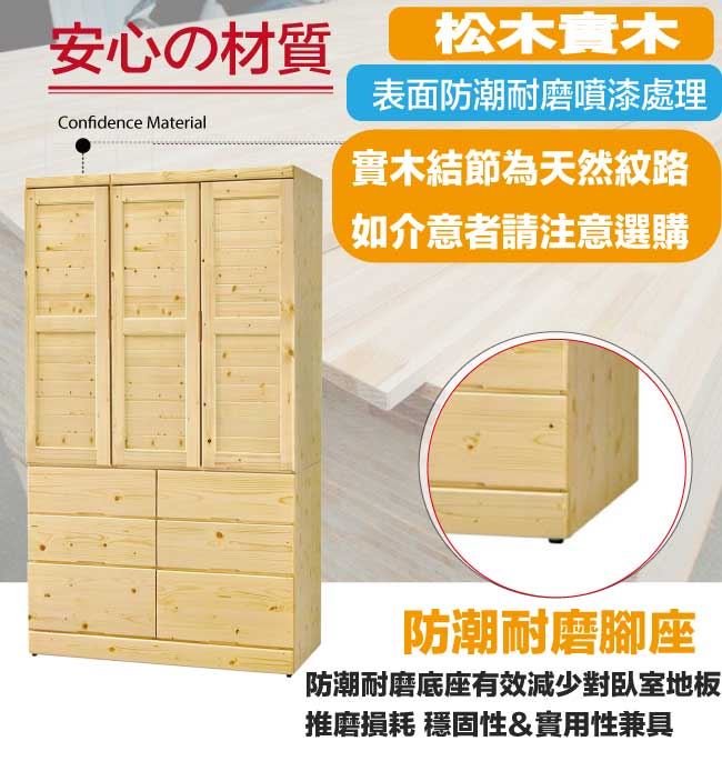 材質 | ◆產品名稱:【綠家居】亞湯卡3.9尺實木三門六抽衣櫃 尺寸:(寬)116x(深)58(高)200/公分 ◆材質: 材質:松木實木材質+防潮耐磨腳座+五金滑軌結構 噴漆:防潮耐磨噴漆處理 木材上有些許實木結節為天然紋路 如介意者請注意選購