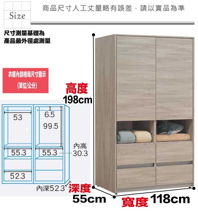 材質 | ◆產品名稱:【綠家居】海洛3.9尺二門四抽中空衣櫃 尺寸:(寬)118x(深)55x(高)198/公分 ◆材質: 材質:防蛀木心板+防潮耐磨腳座+五金滑軌結構 噴漆:防潮耐磨噴漆處理 |