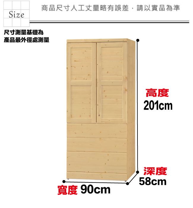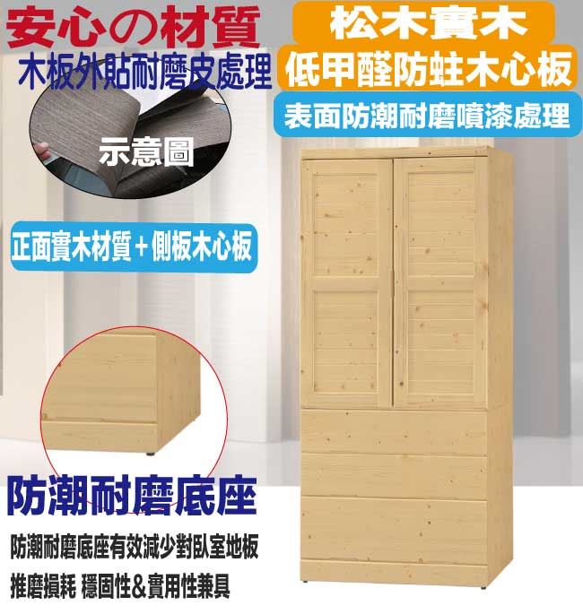 材質 | ◆產品名稱:【綠家居】范斯3尺實木二門三抽衣櫃 尺寸:(寬)90x(深)58x(高)201/公分 ◆材質: 材質:松木實木+防蛀木心板+防潮耐磨底座+五金滑軌結構 噴漆:防潮耐磨噴漆處理 |