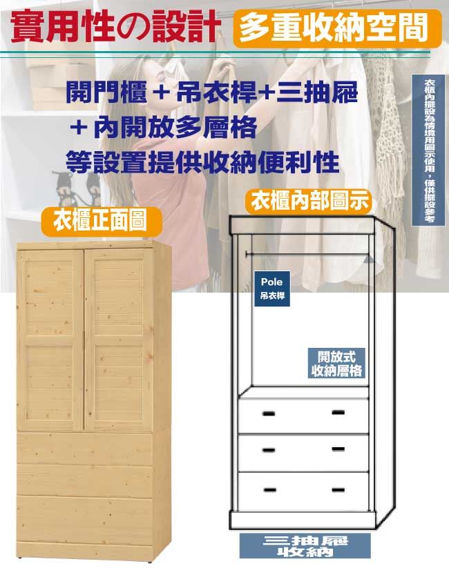 【綠家居】范斯3尺實木二門三抽衣櫃