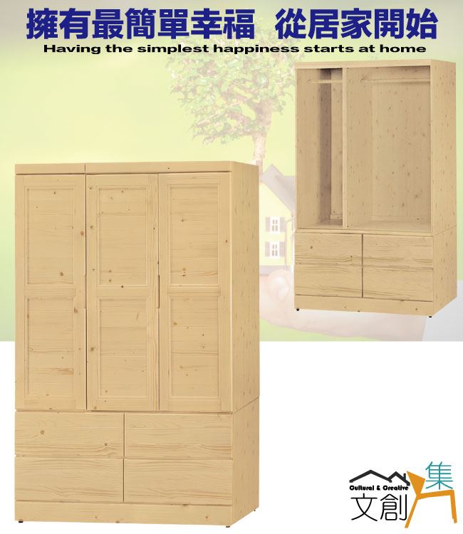 商 品 介 紹 | 【綠家居】范斯3.9尺實木三門四抽衣櫃 松木紋色系+現代簡約風格+安心材質製造,使用放心+搭配居家更便利,整體採用松木實木+防蛀木心板+防潮耐磨底座+五金滑軌結構等安心材質製造搭配外層採用優莉坦耐磨全包式噴漆處理 ,採用開門櫃+吊衣桿+四抽屜+內開放層格等收納空間設計,全由專人配送到家,專業安心服務,替你省下更多時間! 【商品特色】 松木紋色系+現代簡約風格+安心材質製造,使用放心+搭配居家更便利 松木實木+防蛀木心板+防潮耐磨底座+五金滑軌結構等安心材質製造 採用開門櫃+吊衣桿+四抽屜+內開放層格等收納空間設計 此商品不需要DIY組立,此商品為組立後之成品 品質保證、專業設計、貼心服務 全由專人配送到家,專業安心服務,替您省下更多時間