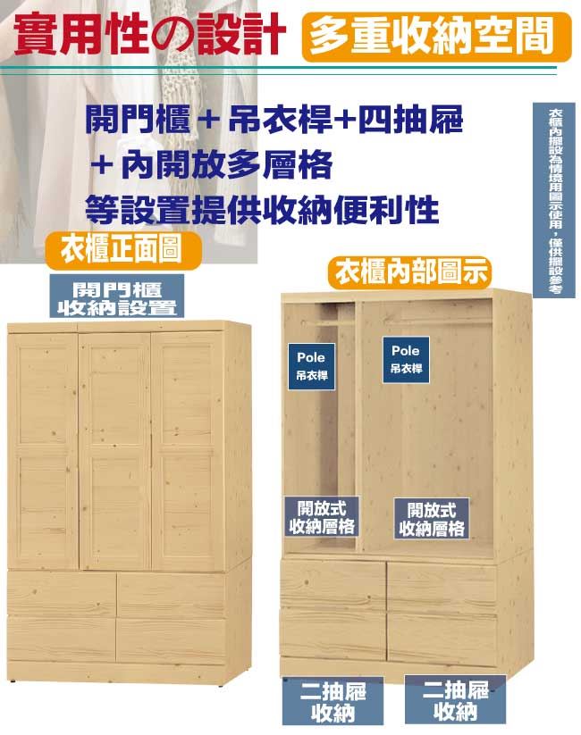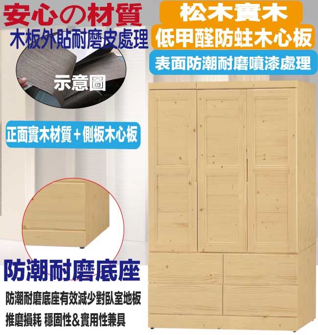 【綠家居】范斯3.9尺實木三門四抽衣櫃