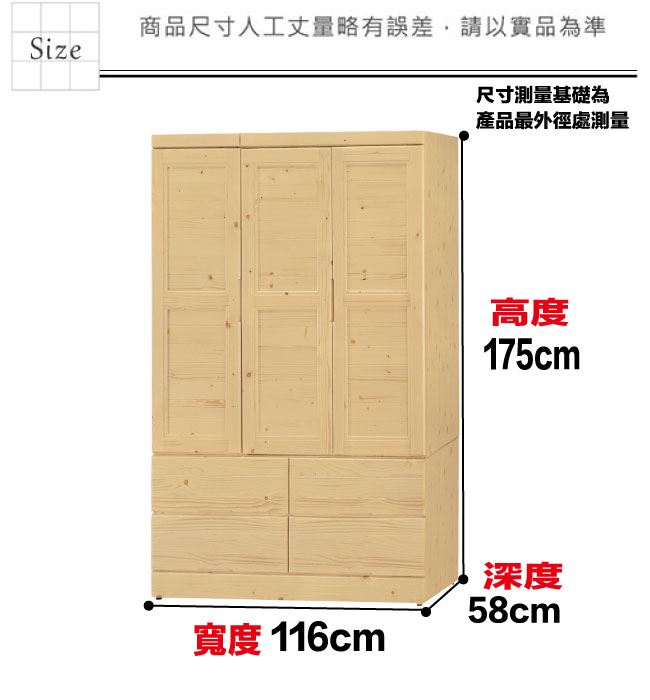材質 | ◆產品名稱:【綠家居】范斯3.9尺實木三門四抽衣櫃 尺寸:(寬)116x(深)58x(高)175/公分 ◆材質: 材質:松木實木+防蛀木心板+防潮耐磨底座+五金滑軌結構 噴漆:防潮耐磨噴漆處理 |