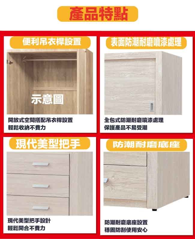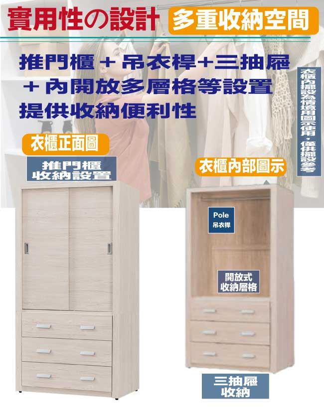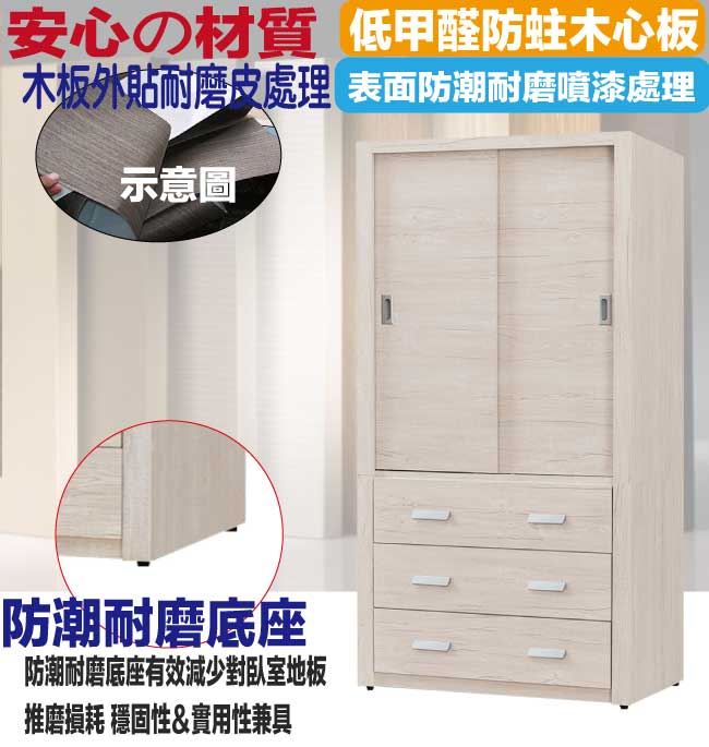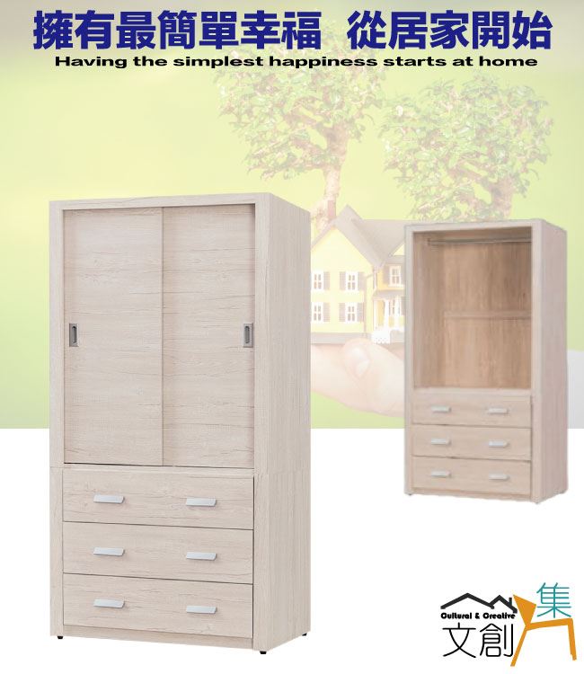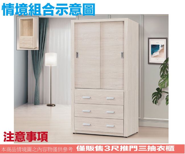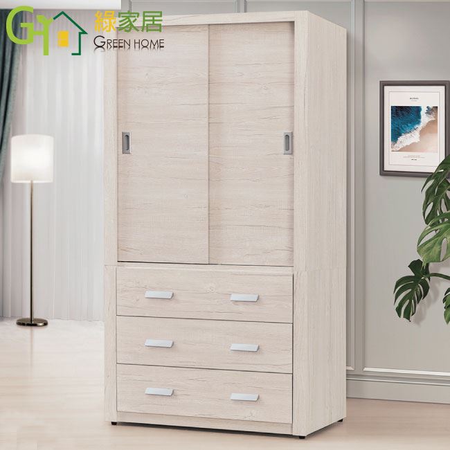 商 品 介 紹 | 【綠家居】克利提3尺推門三抽衣櫃 淺橡木紋色系+現代簡約風格+安心材質製造,使用放心+搭配居家更便利,整體採用防蛀木心板+防潮耐磨底座+五金滑軌結構等安心材質製造搭配外層採用優莉坦耐磨全包式噴漆處理 ,採用推門櫃+吊衣桿+三抽屜+內開放層格等收納空間設計,全由專人配送到家,專業安心服務,替你省下更多時間! 【商品特色】 淺橡木紋色系+現代簡約風格+安心材質製造,使用放心+搭配居家更便利 防蛀木心板+防潮耐磨底座+五金滑軌結構等安心材質製造 採用推門櫃+吊衣桿+三抽屜+內開放層格等收納空間設計 此商品不需要DIY組立,此商品為組立後之成品 品質保證、專業設計、貼心服務 全由專人配送到家,專業安心服務,替您省下更多時間