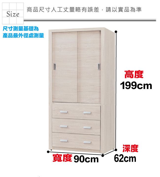 材質 | ◆產品名稱:【綠家居】克利提3尺推門三抽衣櫃 尺寸:(寬)90x(深)62x(高)199/公分 ◆材質: 材質:防蛀木心板+防潮耐磨底座+五金滑軌結構 噴漆:防潮耐磨噴漆處理 |