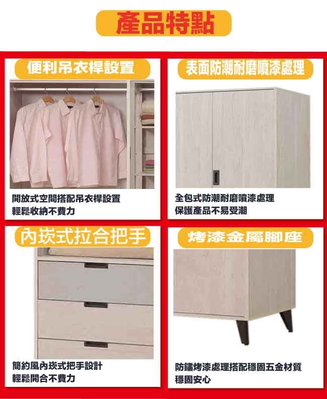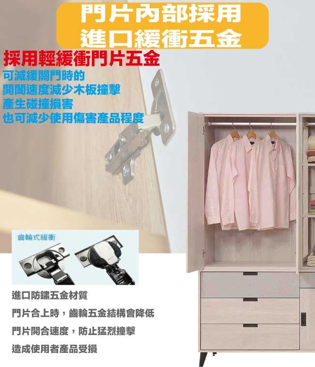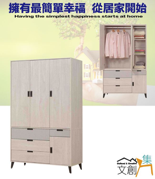 商 品 介 紹 | 【綠家居】達斯3.9尺四門四抽衣櫃 木紋雙色系+現代簡約風格+安心材質製造,使用放心+搭配居家更便利,整體採用防蛀木心板+烤漆金屬腳座+五金滑軌結構+防夾手緩衝門片五金等材質搭配外層採用防潮耐磨噴漆處理,採用開門櫃+吊衣桿+四抽屜+內開放式層格等收納空間設計,全由專人配送到家,專業安心服務,替你省下更多時間! 【商品特色】 木紋雙色系+現代簡約風格+安心材質製造,使用放心+搭配居家更便利 防蛀木心板+五金滑軌結構+烤漆金屬腳座+防夾手緩衝門片五金等材質製造 採用開門櫃+吊衣桿+四抽屜+內開放式層格等收納空間設計 此商品不需要DIY組立,此商品為組立後之成品 品質保證、專業設計、貼心服務 全由專人配送到家,專業安心服務,替您省下更多時間