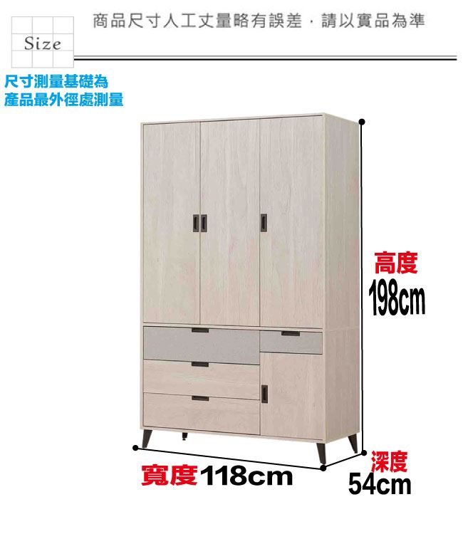 材質 | ◆產品名稱:【綠家居】達斯3.9尺四門四抽衣櫃 尺寸:(寬)118x(深)54(高)198/公分 ◆材質: 材質:防蛀木心板+五金滑軌結構+烤漆金屬腳座+防夾手緩衝門片五金 噴漆:防潮耐磨噴漆處理 |