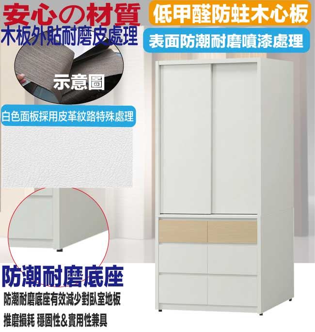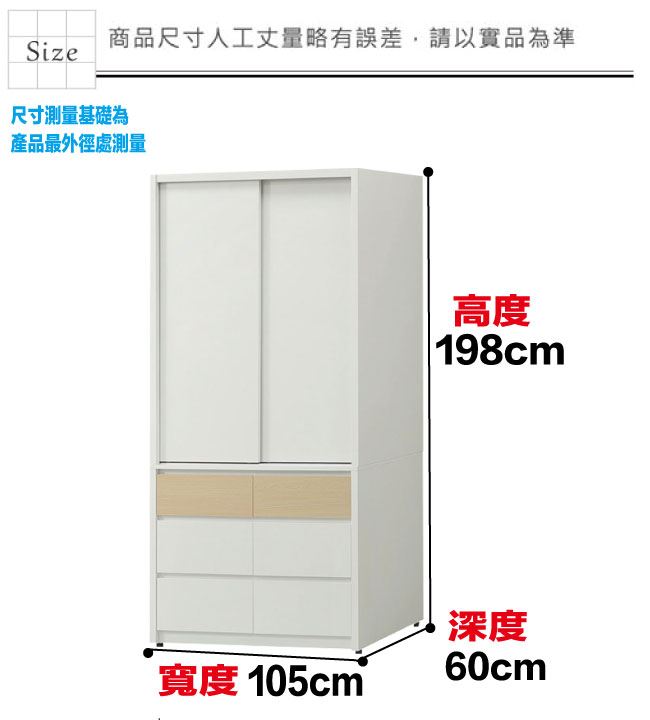 材質 | ◆產品名稱:【綠家居】歐瑞雙色3.5尺開&推門六抽加高衣櫃組合 尺寸:(寬)105x(深)60x(高)240/公分 ◆材質: 材質:防蛀木心板+防潮耐磨底座+防夾手緩衝門片五金+五金滑軌結構+白色面板外層採用皮革紋路特殊處理 噴漆:防潮耐磨噴漆處理 |