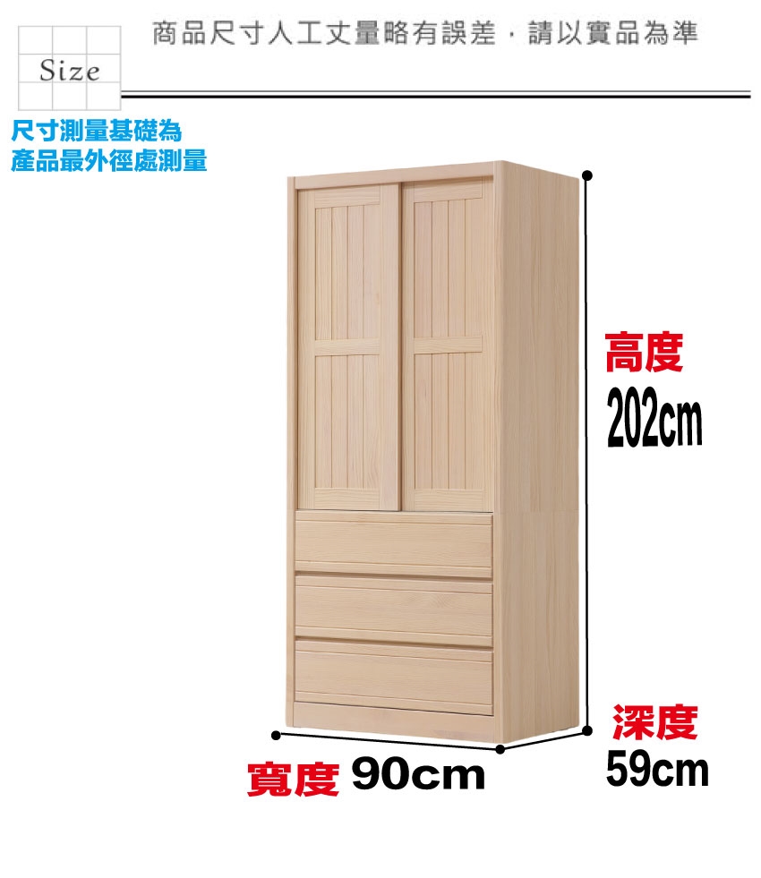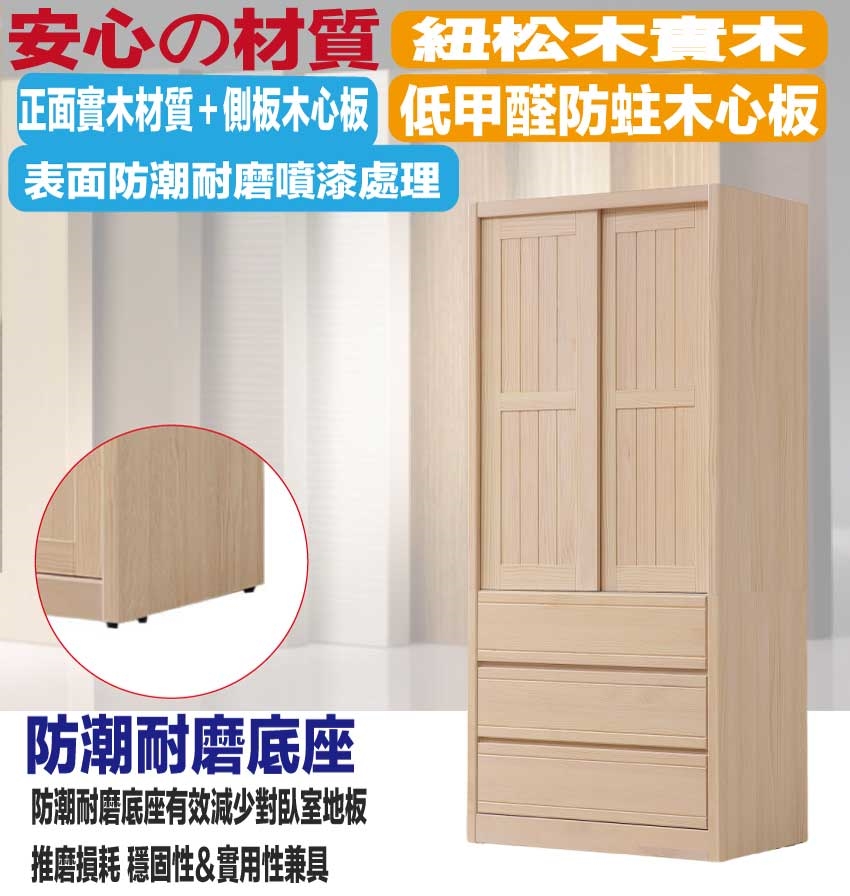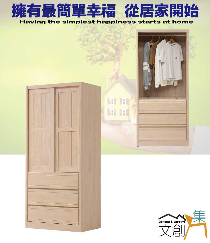 - ◆產品名稱:【綠家居】希望3尺實木推門三抽衣櫃