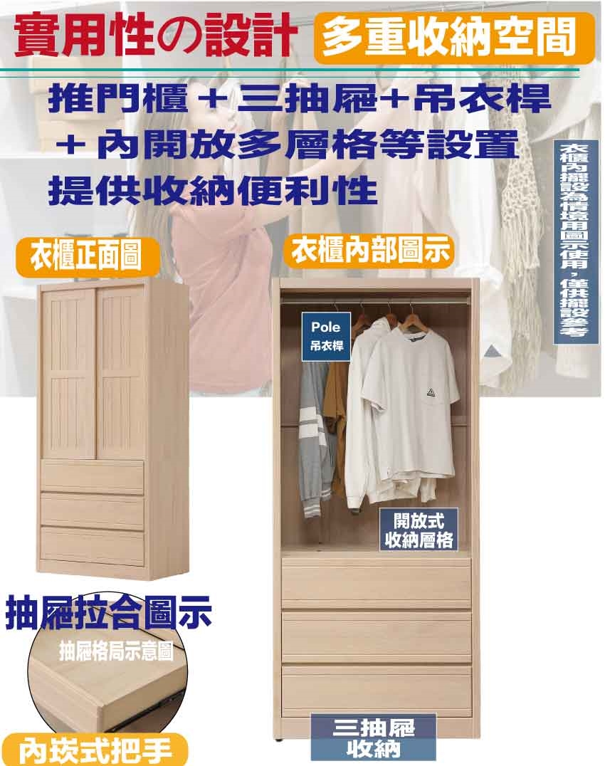 推門櫃+吊衣桿+三抽屜