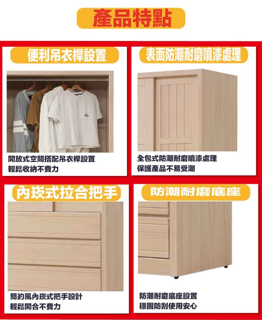★偏遠地區需額外加收運費,下標請先問與答詢問★ ★下訂前注意 由於商品流動較快,下訂前請先詢問是否有貨在下訂喔~★ 【綠家居】希望3尺實木推門三抽衣櫃 洗白木紋色系+安心材質製造,使用放心+搭配居家更便利,採用紐松木實木+防蛀木心板+實木防磨底座+五金滑軌結構等安心材質製造 ,外層採用防潮耐磨噴漆處理搭配採用推門櫃+吊衣桿+三抽屜+內開放層格等收納空間設計,全由專人配送到家,專業安心服務,替你省下更多時間!