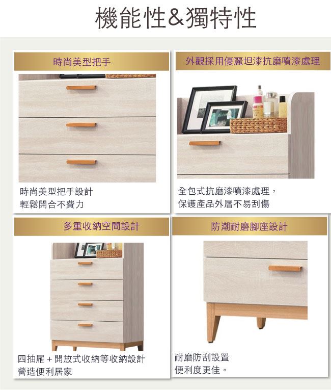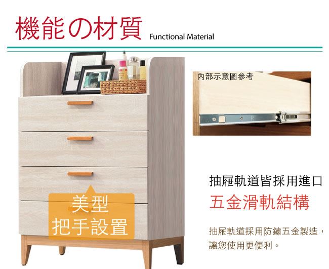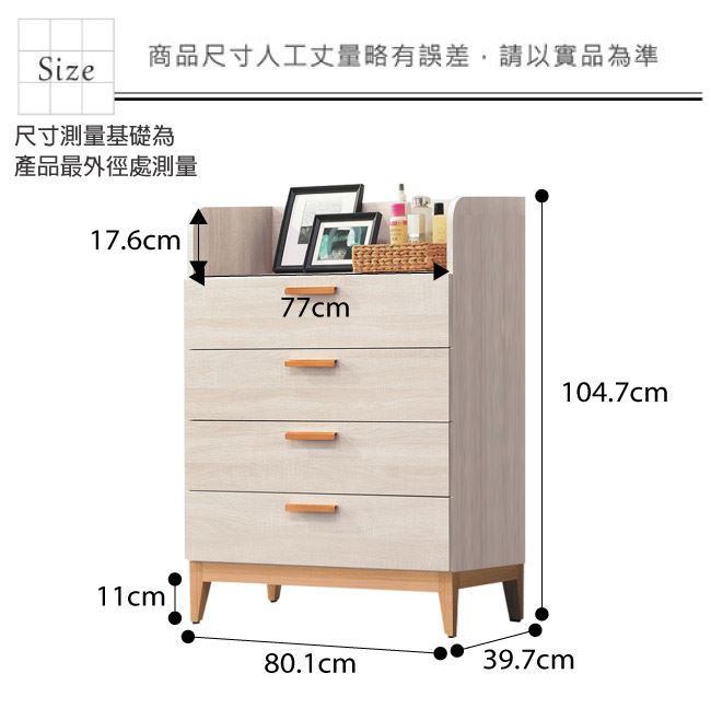 材質 | ◆產品名稱:【綠家居】 伊森瑪 現代2.7尺木紋四斗櫃/收納櫃 產品尺寸: 收納櫃尺寸:(寬)80.1x(深)39.7x(高)104.7/公分 ◆材質: 材質:防蛀木心板+防潮耐磨腳座 材質:五金滑軌結構 塗漆:優利坦全包式耐磨噴漆處理 |