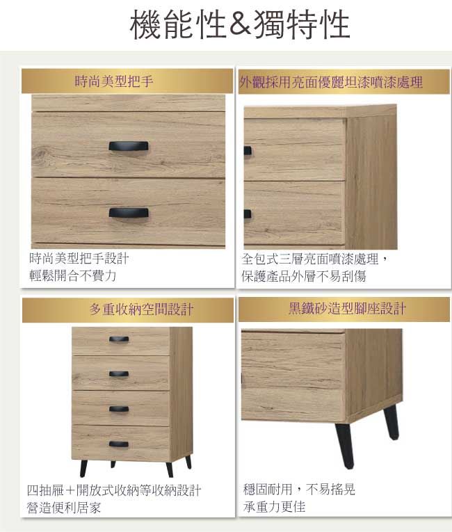 商品介紹 | 【綠家居】奧庫 橡木紋2尺四抽斗櫃 橡木紋色系+現代簡約風格+安心材質製造,整體採用防蛀木心板+黑鐵砂腳座+五金滑軌結構等安心材質製造,產品外層採用防潮耐磨噴漆處理搭配採用四抽屜+開放式桌面收納等收納空間設計,全由專人配送到家,專業安心服務,替你省下更多時間! 【商品特色】 橡木紋色系+現代簡約風格+安心材質製造,使用放心+搭配居家更便利 採用防蛀木心板+黑鐵砂腳座+五金滑軌結構等安心材質製造 產品外層採用防潮耐磨噴漆處理 搭配採用四抽屜+開放式桌面收納等收納空間設計 此商品不需要DIY組立,此商品為組立後之成品 品質保證、專業設計、貼心服務 全由專人配送到家,專業安心服務,替您省下更多時間 |
