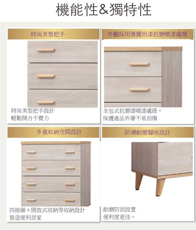 商品 介紹 | 【綠家居】羅西斯 雙色2.7尺四抽斗櫃 木紋雙色系+現代簡約風格+安心材質製造,整體採用防蛀木心板+五金滑軌結構+防潮耐磨腳座等安心材質製造,外層採用優利坦全包式耐磨噴漆處理搭配四抽屜+開放式收納等收納空間設計,全由專人配送到家,專業安心服務,替你省下更多時間! 【商品特色】 木紋雙色系+現代簡約風格+安心材質製造,使用放心+搭配居家更便利 採用防蛀木心板+五金滑軌結構+防潮耐磨腳座等安心材質製造 四抽屜+開放式收納等收納空間設計 此商品不需要DIY組立,此商品為組立後之成品 品質保證、專業設計、貼心服務 全由專人配送到家,專業安心服務,替您省下更多時間 |