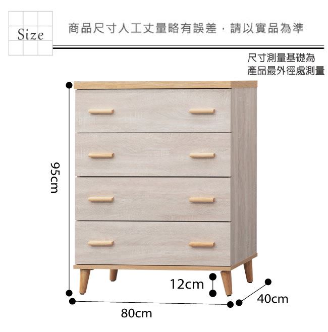 材質 | ◆產品名稱: 【綠家居】羅西斯 雙色2.7尺四抽斗櫃 產品尺寸: 尺寸:(寬)80x(深)40x(高)95/公分 ◆材質: 材質:防蛀木心板+防潮耐磨腳座 材質:五金滑軌結構 塗漆:優利坦全包式耐磨噴漆處理