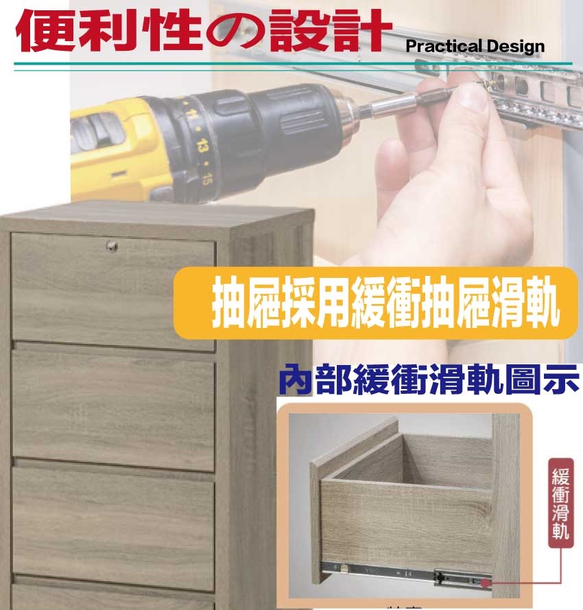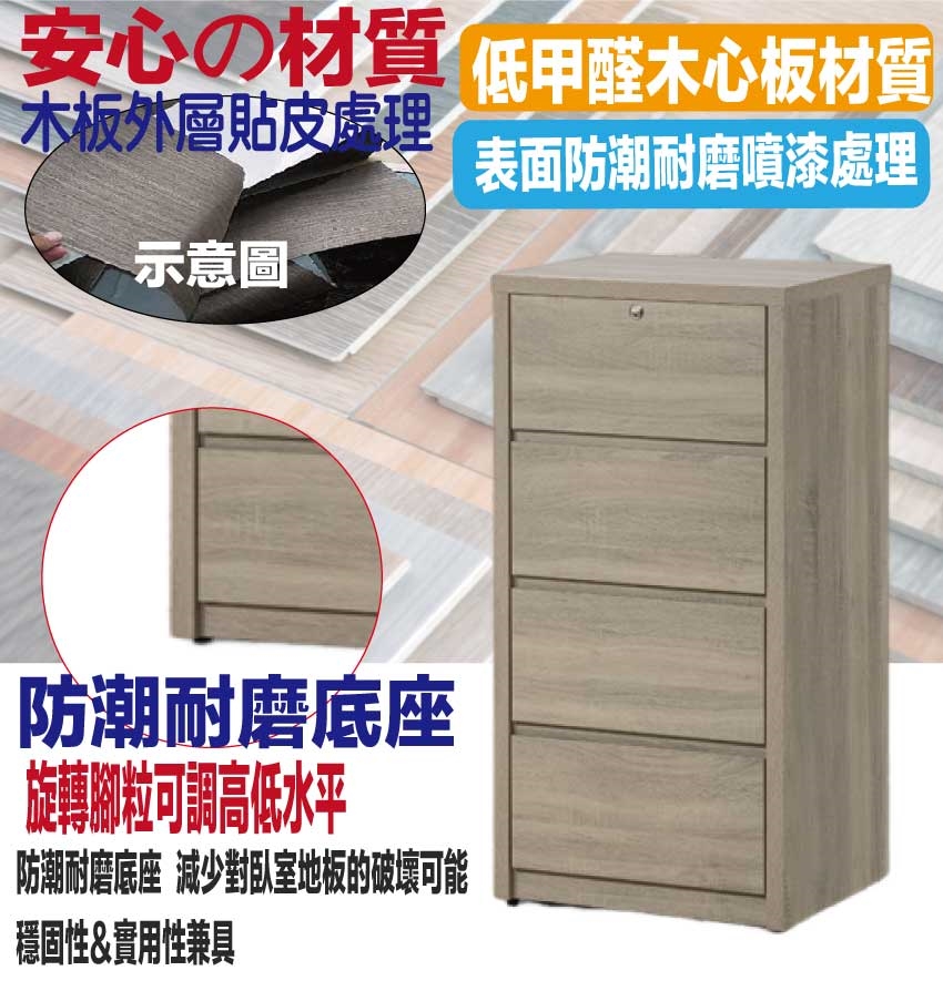 材質:防蛀木心板+防潮耐磨底座(可調高低水平)+緩衝抽屜滑軌
