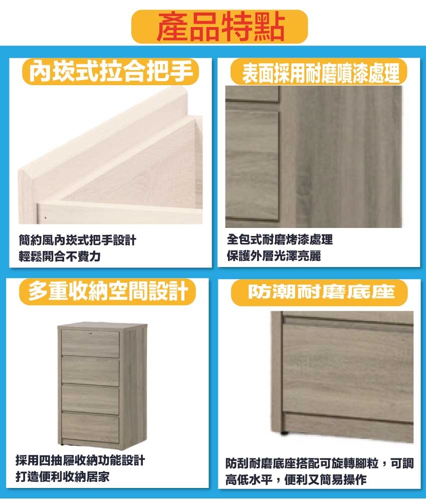 防蛀木心板+防潮耐磨底座(可調高低水平)等安心材質製造