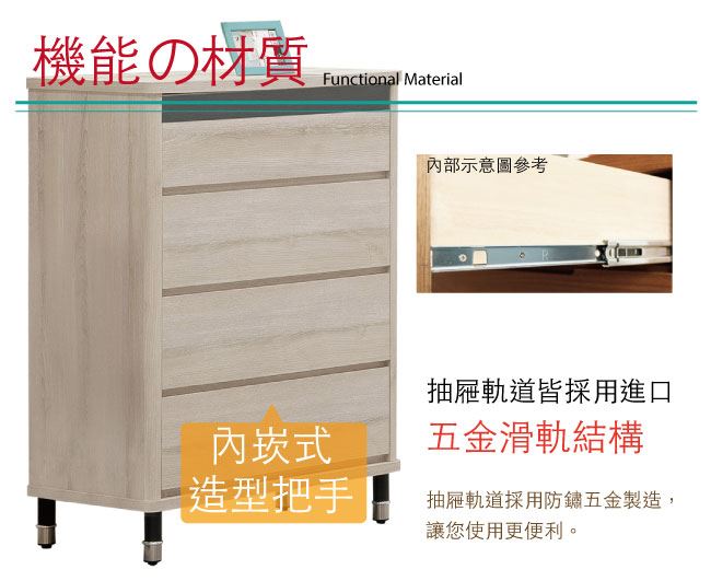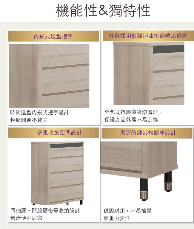 商品介紹 | 【綠家居】額爾 現代2.6尺四斗櫃/收納櫃 白橡木紋色系+現代簡約風格+安心材質製造,整體採用防蛀木心板+防鏽鍍烙黑漆腳座+五金滑軌結構等安心材質製造,外層採用優利坦全包式耐磨噴漆處理搭配四抽屜+開放式收納等收納設計,全由專人配送到家,專業安心服務,替你省下更多時間! 【商品特色】 白橡木紋色系+現代簡約風格+安心材質製造,使用放心+搭配居家更便利 採用防蛀木心板+防鏽鍍烙黑漆腳座+五金滑軌結構等安心材質製造 四抽屜+開放式收納等收納設計 此商品不需要DIY組立,此商品為組立後之成品 品質保證、專業設計、貼心服務 全由專人配送到家,專業安心服務,替您省下更多時間 |