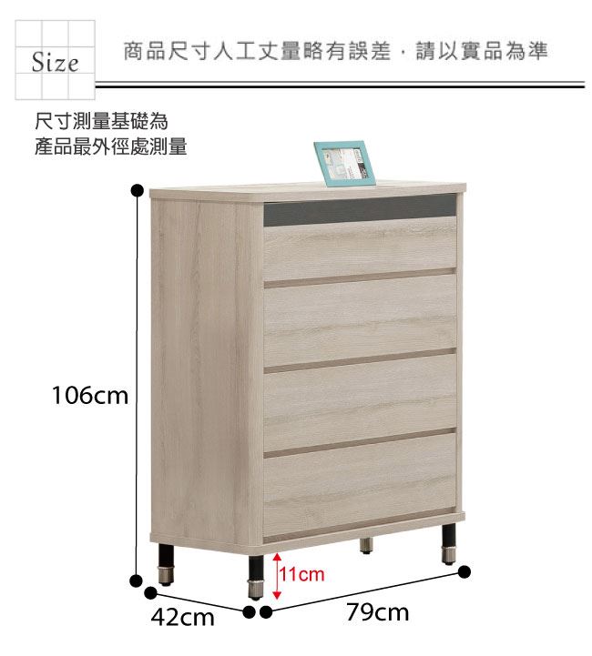 材質 | ◆產品名稱:【綠家居】 額爾 現代2.6尺四斗櫃/收納櫃 產品尺寸: 收納櫃尺寸:(寬)79x(深)42x(高)106/公分 ◆材質: 材質:防蛀木心板+防鏽鍍烙黑漆腳座 材質:五金滑軌結構 塗漆:優利坦全包式耐磨噴漆處理 |