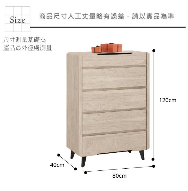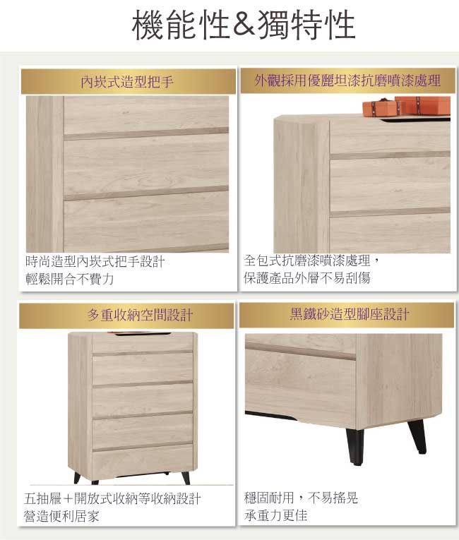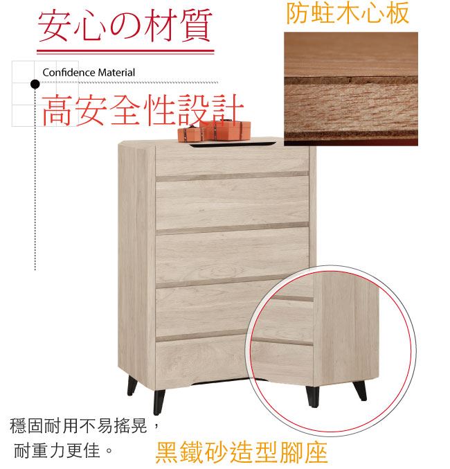 材質 | ◆產品名稱: 【綠家居】卡蘭 淺橡2.7尺五抽斗櫃/收納櫃 產品尺寸: 尺寸:(寬)80x(深)40x(高)120/公分 ◆材質: 材質:防蛀木心板+黑鐵砂腳座 材質:五金滑軌結構 塗漆:優利坦全包式耐磨噴漆處理