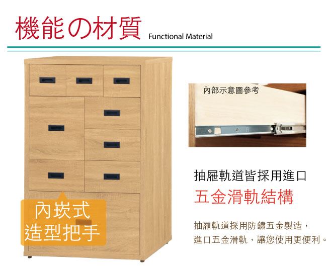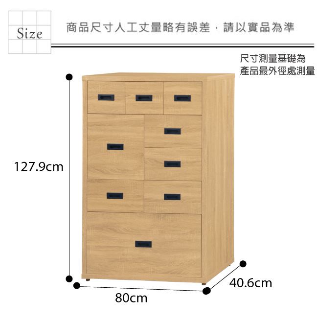 材質 | ◆產品名稱: 【綠家居】瓜達 時尚2.7尺九抽斗櫃(二色可選) 尺寸:(寬)80x(深)40.6x(高)127.9/公分 ◆材質: 材質:防蛀木心板+防潮耐磨腳座+五金滑軌結構 噴漆:防潮耐磨噴漆處理