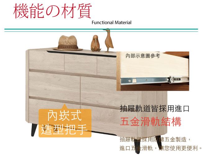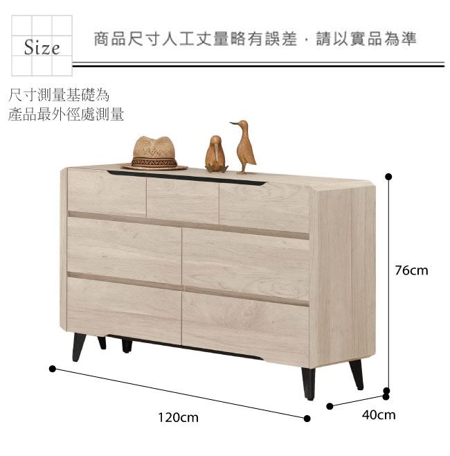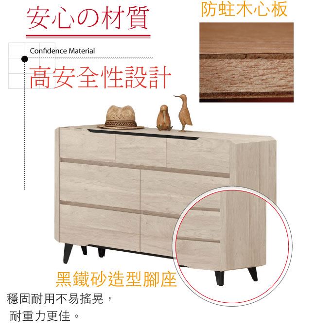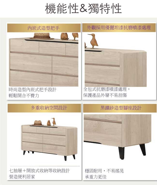 材質 | ◆產品名稱: 【綠家居】卡蘭 淺橡4尺七抽斗櫃/收納櫃 產品尺寸: 尺寸:(寬)120x(深)40x(高)76/公分 ◆材質: 材質:防蛀木心板+黑鐵砂腳座 材質:五金滑軌結構 塗漆:優利坦全包式耐磨噴漆處理