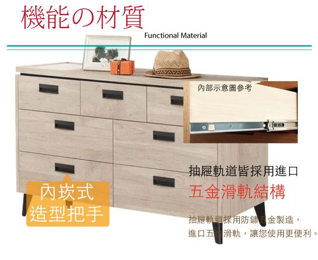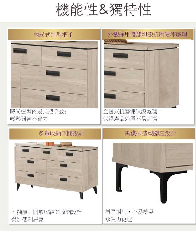 材質 | ◆產品名稱: 【綠家居】薇妮特 橡木紋4尺七抽斗櫃 產品尺寸: 尺寸:(寬)120x(深)40x(高)75.5/公分 ◆材質: 材質:防蛀木心板+黑鐵砂腳座 材質:五金滑軌結構 塗漆:優利坦全包式耐磨噴漆處理