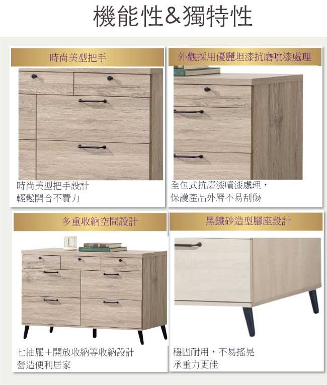 商 品 介 紹 | 【綠家居】夢利4尺七抽斗櫃(二色可選) 二色可選+現代簡約風格+安心材質製造,整體採用防蛀木心板+五金滑軌結構+防鏽黑漆腳座等安心材質製造,產品外層採用防潮耐磨噴漆處理搭配採用七抽屜+開放式收納等空間設計,全由專人配送到家,專業安心服務,替你省下更多時間! 【商品特色】 二色可選+現代簡約風格+安心材質製造,使用放心+搭配居家更便利 採用防蛀木心板+五金滑軌結構+防鏽黑漆腳座等安心材質製造 產品外層採用防潮耐磨噴漆處理 搭配採用七抽屜+開放式收納等空間設計 此商品不需要DIY組立,此商品為組立後之成品 全由專人配送到家,專業安心服務,替您省下更多時間 |