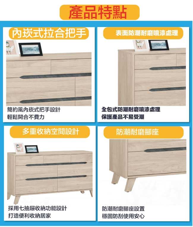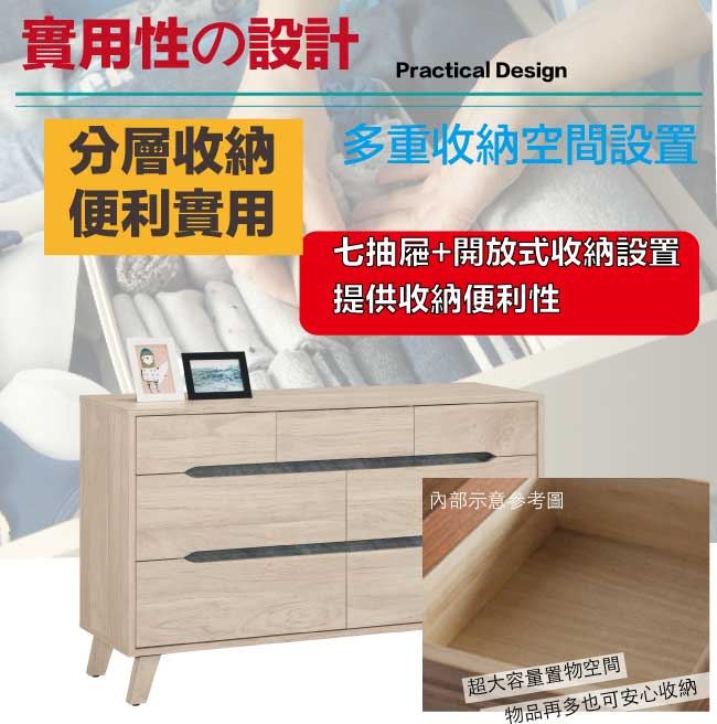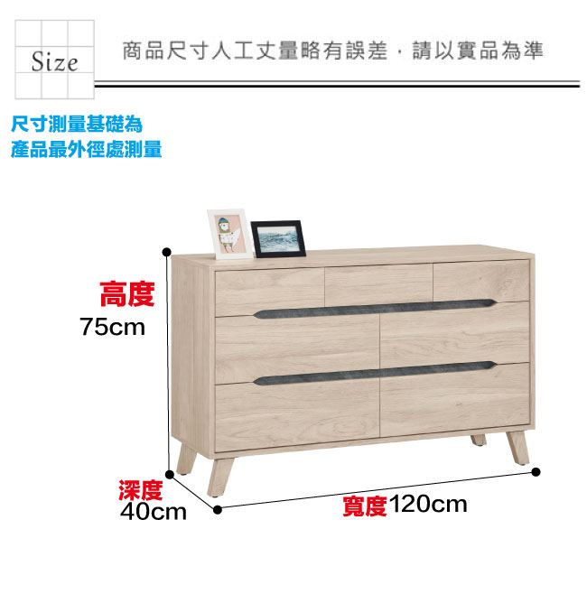 材質 | ◆產品名稱:【綠家居】比克坡4尺七抽斗櫃 尺寸:(寬)120x(深)40(高)75/公分 ◆材質: 材質:防蛀木心板+防潮耐磨腳座+五金滑軌結構 噴漆:防潮耐磨噴漆處理
