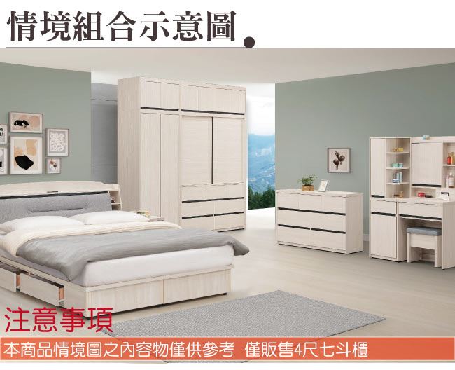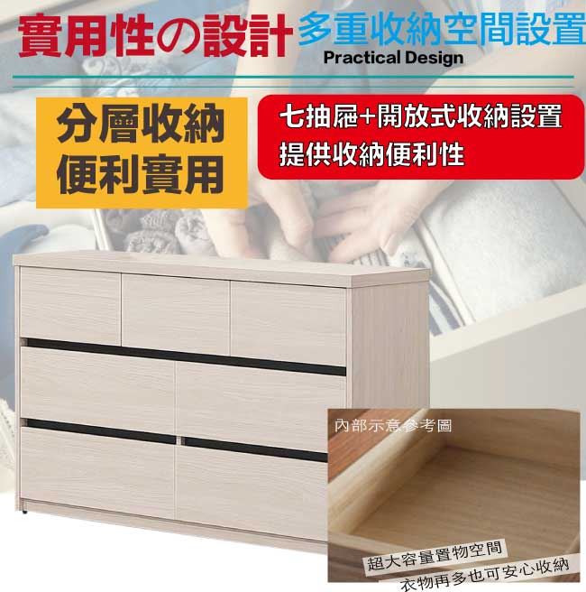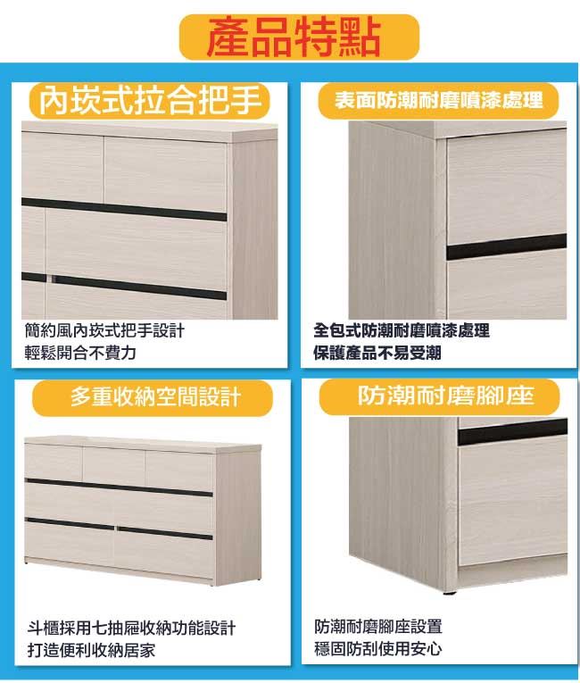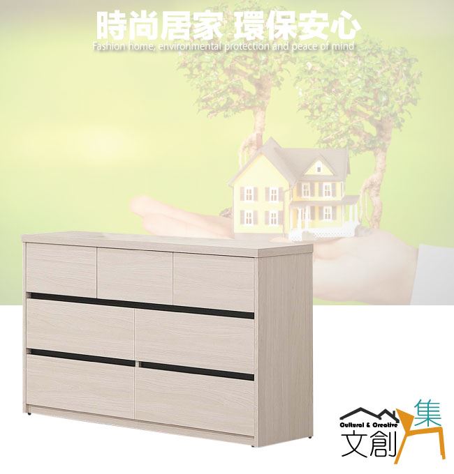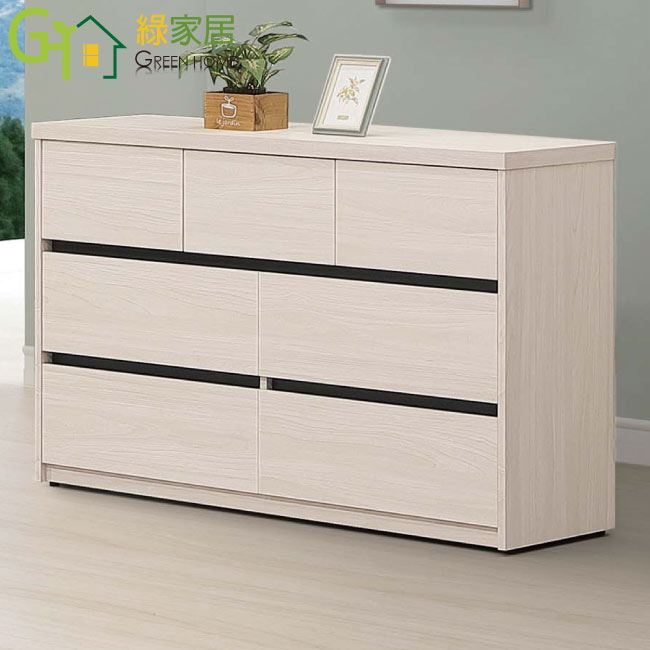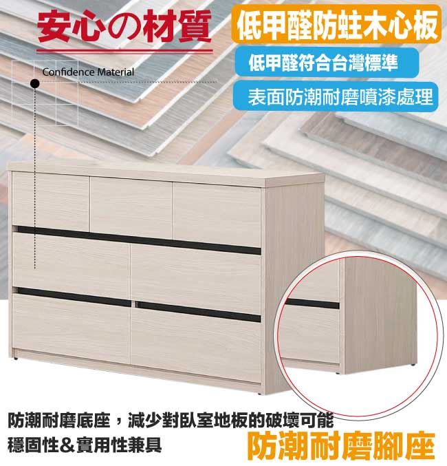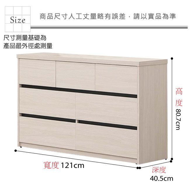 材質 | ◆產品名稱:【綠家居】亞卡4尺七抽斗櫃 尺寸:(寬)121x(深)40.5(高)80.7/公分 ◆材質: 材質:防蛀木心板+防潮耐磨腳座+五金滑軌結構 噴漆:防潮耐磨噴漆處理
