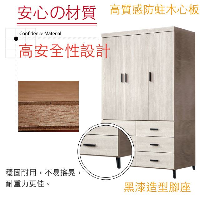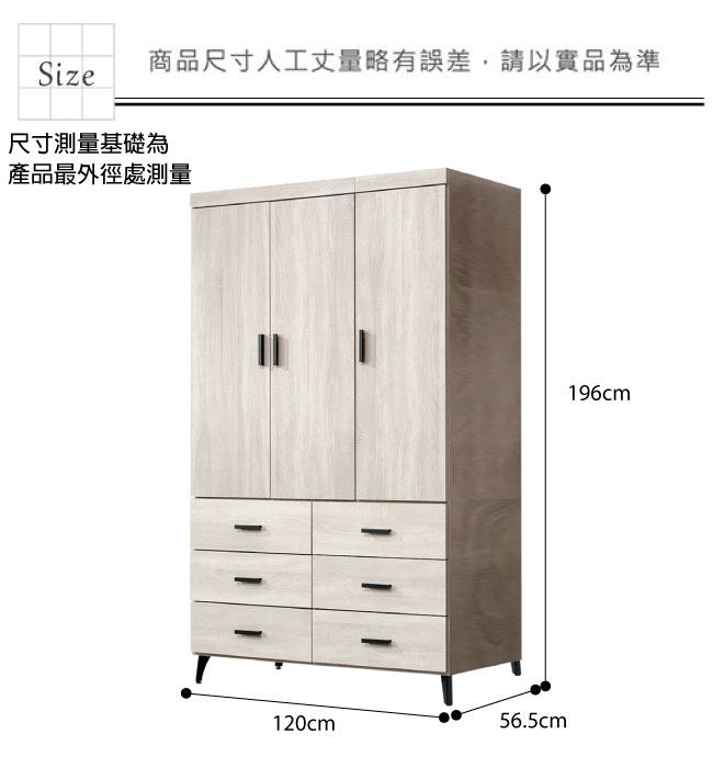 材質 | ◆產品名稱:【綠家居】邁尼耶 時尚4尺三門六抽衣櫃/收納櫃 尺寸:(寬)120x(深)56.5x(高)196/公分 ◆材質: 材質:防蛀木心板+五金滑軌結構+防潮黑漆腳座+防夾手緩衝門片五金+強化玻璃鏡面 |