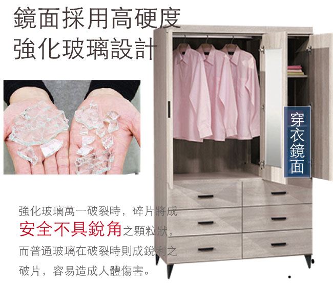 商品介紹 | 【綠家居】邁尼耶 時尚4尺三門六抽衣櫃/收納櫃 橡木紋色系+現代簡約風格+安心材質製造,整體採用防蛀木心板+五金滑軌結構+防潮黑漆腳座+防夾手緩衝門片五金+強化玻璃鏡面等安心材質製造,搭配採用開門櫃+吊衣桿+六抽屜+穿衣鏡面設置+內開放式收納層格等收納空間設計,全由專人配送到家,專業安心服務,替你省下更多時間! 【商品特色】 橡木紋色系+現代簡約風格+安心材質製造,使用放心+搭配居家更便利 採用防蛀木心板+五金滑軌結構+防潮黑漆腳座+防夾手緩衝門片五金+強化玻璃鏡面等安心材質製造 採用開門櫃+吊衣桿+六抽屜+穿衣鏡面設置+內開放式收納層格等收納空間設計 此商品不需要DIY組立,此商品為組立後之成品 品質保證、專業設計、貼心服務 全由專人配送到家,專業安心服務,替您省下更多時間 |