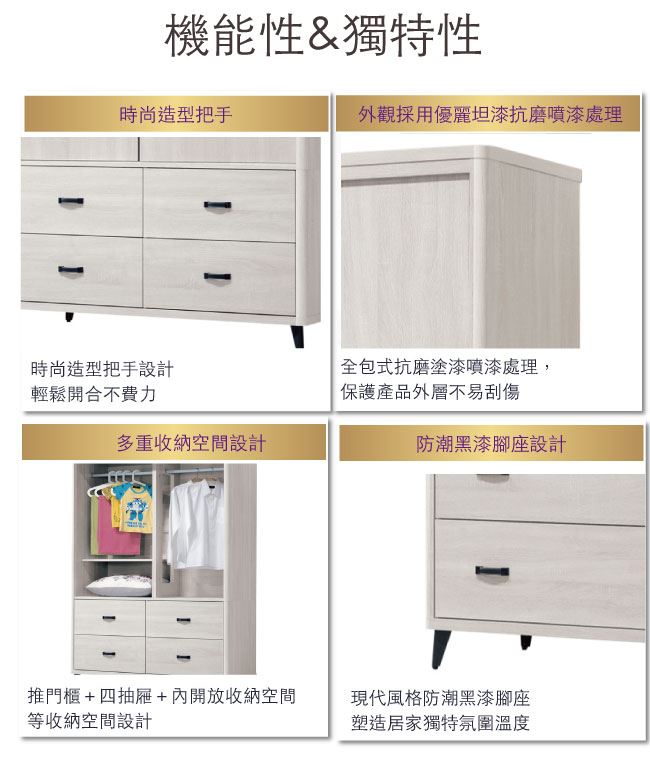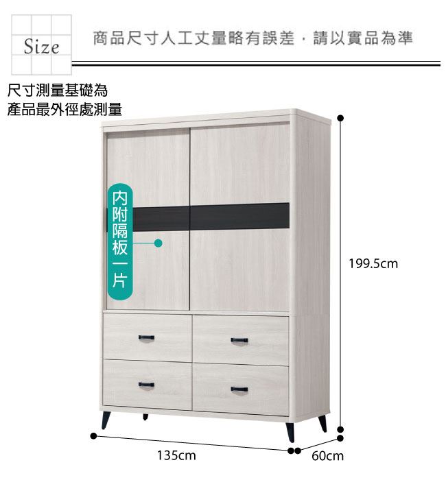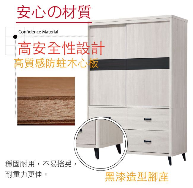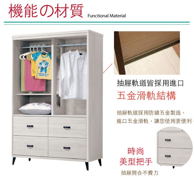 材質 | ◆產品名稱:【綠家居】蓋爾達 時尚4.5尺推門四抽衣櫃/收納櫃 尺寸:(寬)135x(深)60x(高)199.5/公分 ◆材質: 材質:防蛀木心板+五金滑軌結構+防潮黑漆腳座 |