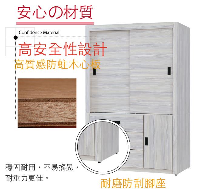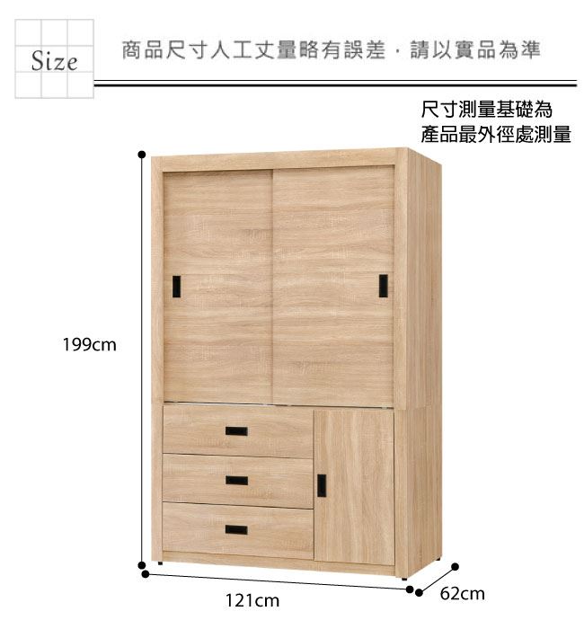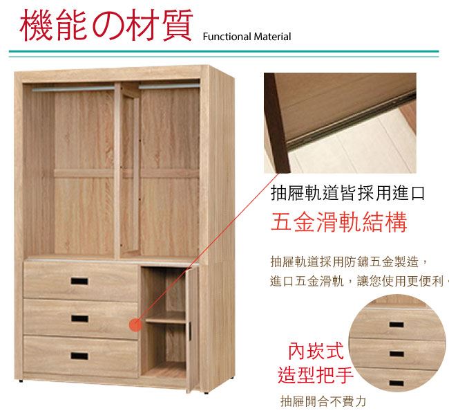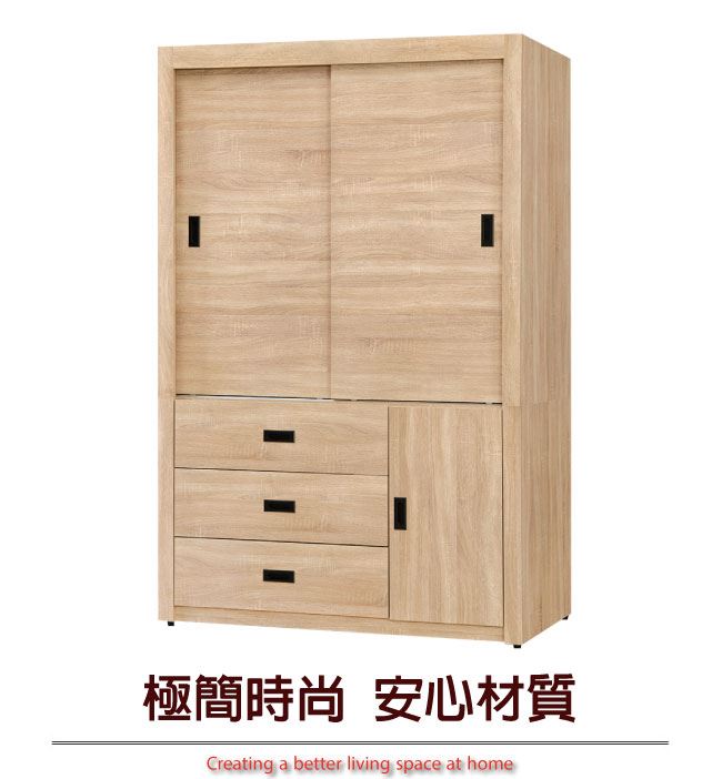 材質 | ◆產品名稱:【綠家居】馬坎巴 時尚4尺推&開門三抽衣櫃/收納櫃(二色可選) 尺寸:(寬)121x(深)62x(高)199/公分 ◆材質: 材質:防蛀木心板+防潮耐磨腳座+五金滑軌結構 |