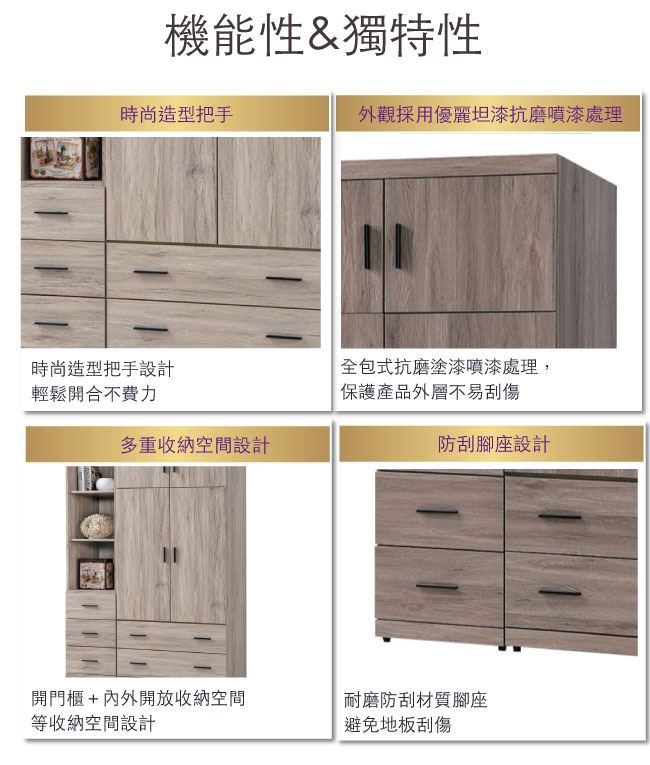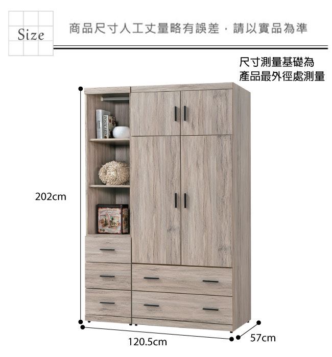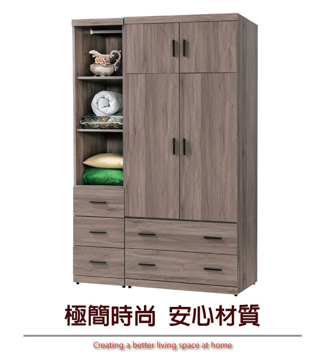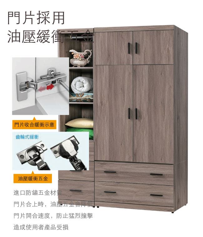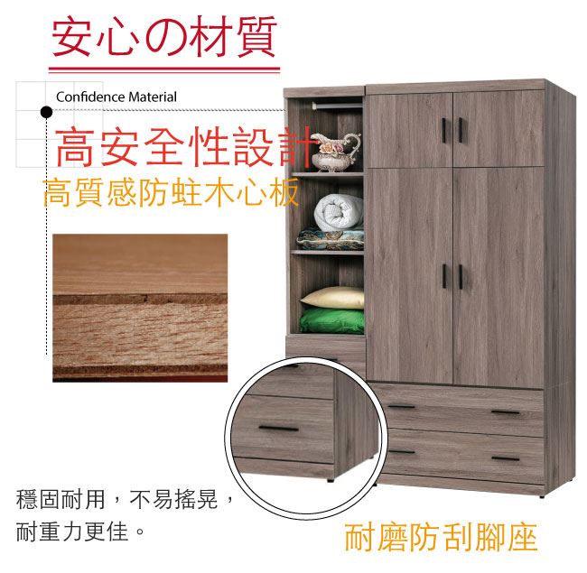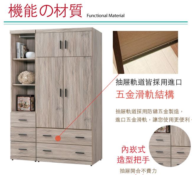 材質 | ◆產品名稱:【綠家居】穆拉姆 時尚4尺四門七抽衣櫃/收納櫃組合(二色可選) 尺寸:(寬)120.5x(深)57x(高)202/公分 ◆材質: 材質:防蛀木心板+五金滑軌結構+防潮耐磨腳座+防夾手緩衝門片五金 |