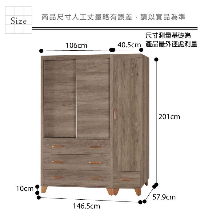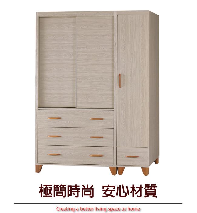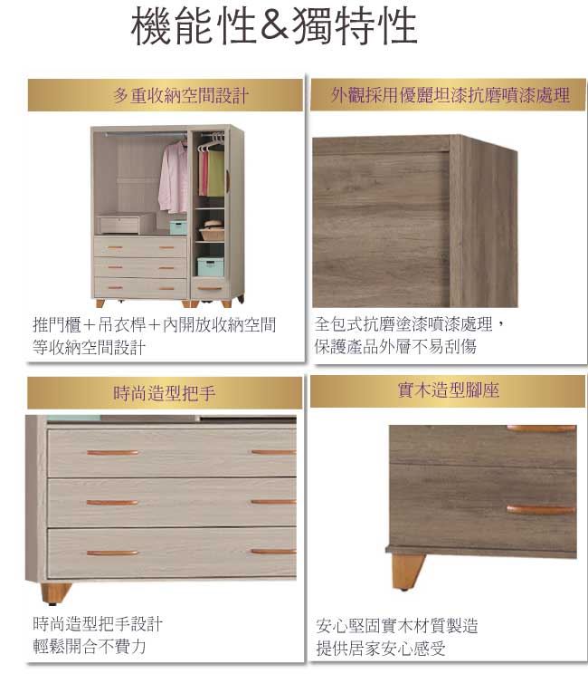 商品介紹 | 【綠家居】法尼莫 開&推門四抽4.9尺多功能衣櫃/收納櫃組合(二色可選) 木紋雙色系+現代簡約風格+安心材質製造,整體採用防蛀木心板+防潮實木腳座+五金滑軌結構+防夾手緩衝門片五金等安心材質製造,外層採用全包式防潮耐磨噴漆處理搭配採用開&推門櫃+吊衣桿+四抽屜(衣櫃內另含小抽屜一個)+內開放式收納層格等收納空間設計,全由專人配送到家,專業安心服務,替你省下更多時間! 【商品特色】 木紋雙色系+現代簡約風格+安心材質製造,使用放心+搭配居家更便利 採用防蛀木心板+防潮實木腳座+五金滑軌結構+防夾手緩衝門片五金等安心材質製造 採用開&推門櫃+吊衣桿+四抽屜(衣櫃內另含小抽屜一個)+內開放式收納層格等收納空間設計 此商品不需要DIY組立,此商品為組立後之成品 品質保證、專業設計、貼心服務 全由專人配送到家,專業安心服務,替您省下更多時間 |