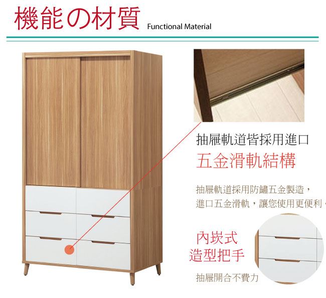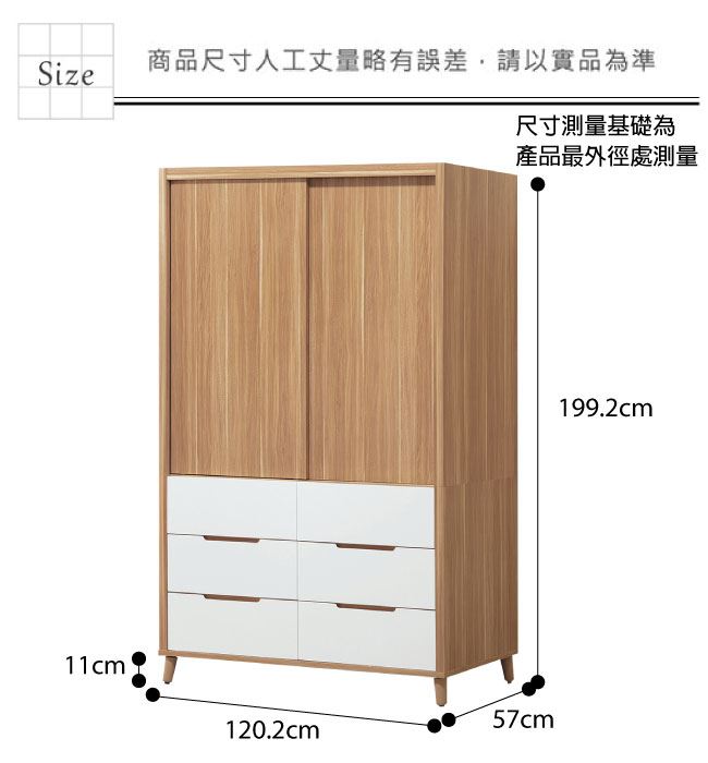 材質 | ◆產品名稱: 【綠家居】法克 雙色4尺推門六抽衣櫃/收納櫃 尺寸:(寬)120.2x(深)57x(高)199.2公分 ◆材質: 材質:防蛀木心板+防潮實木腳座+五金滑軌結構 外層採用全包式防潮耐磨噴漆處理