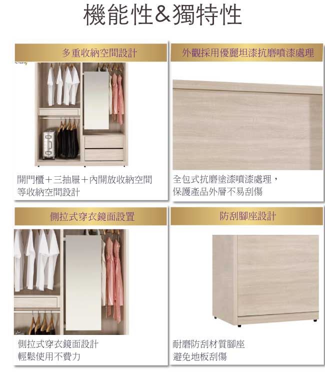 商品介紹 | 【綠家居】海多娜 橡木紋4.9尺推門衣櫃 橡木紋色系+現代簡約風格+安心材質製造,整體採用防蛀木心板+防潮耐磨腳座+五金滑軌結構+強化玻璃鏡面等安心材質製造,外層採用優利坦全包式耐磨噴漆處理搭配推門櫃+吊衣桿+三抽屜(含多宮格抽屜)+穿衣鏡面+內開放式收納等收納空間設計,全由專人配送到家,專業安心服務,替你省下更多時間! 【商品特色】 橡木紋色系+現代簡約風格+安心材質製造,使用放心+搭配居家更便利 採用防蛀木心板+防潮耐磨腳座+五金滑軌結構+強化玻璃鏡面安心材質製造 推門櫃+吊衣桿+三抽屜(含多宮格抽屜)+穿衣鏡面+內開放式收納等收納空間設計 此商品不需要DIY組立,此商品為組立後之成品 品質保證、專業設計、貼心服務 全由專人配送到家,專業安心服務,替您省下更多時間 |